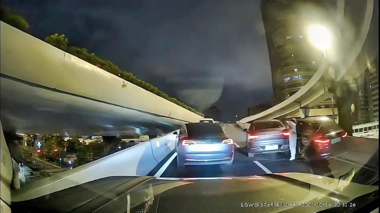 网友爆料,上海高架大柏树转中环,2部新能源发生交通事故,黑色小轿车有惊无险,在护