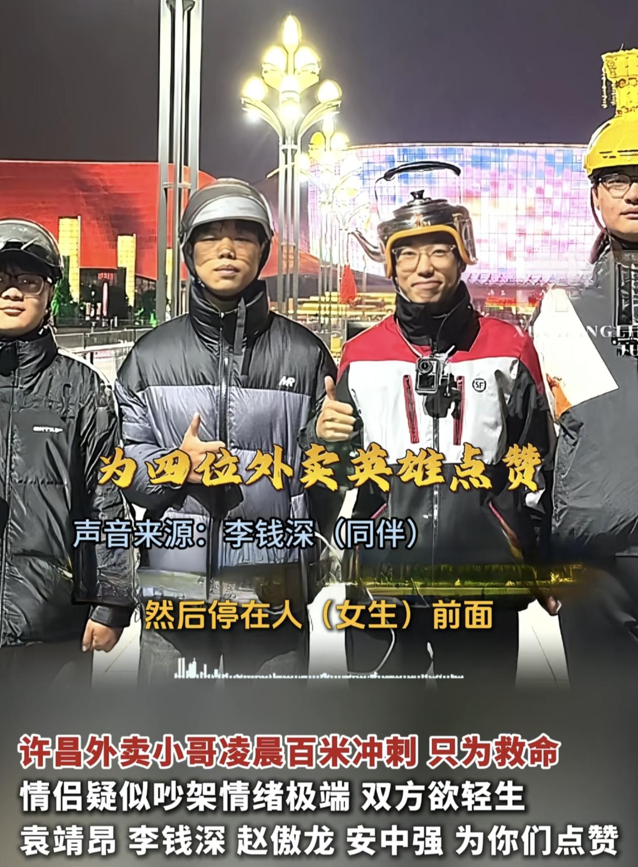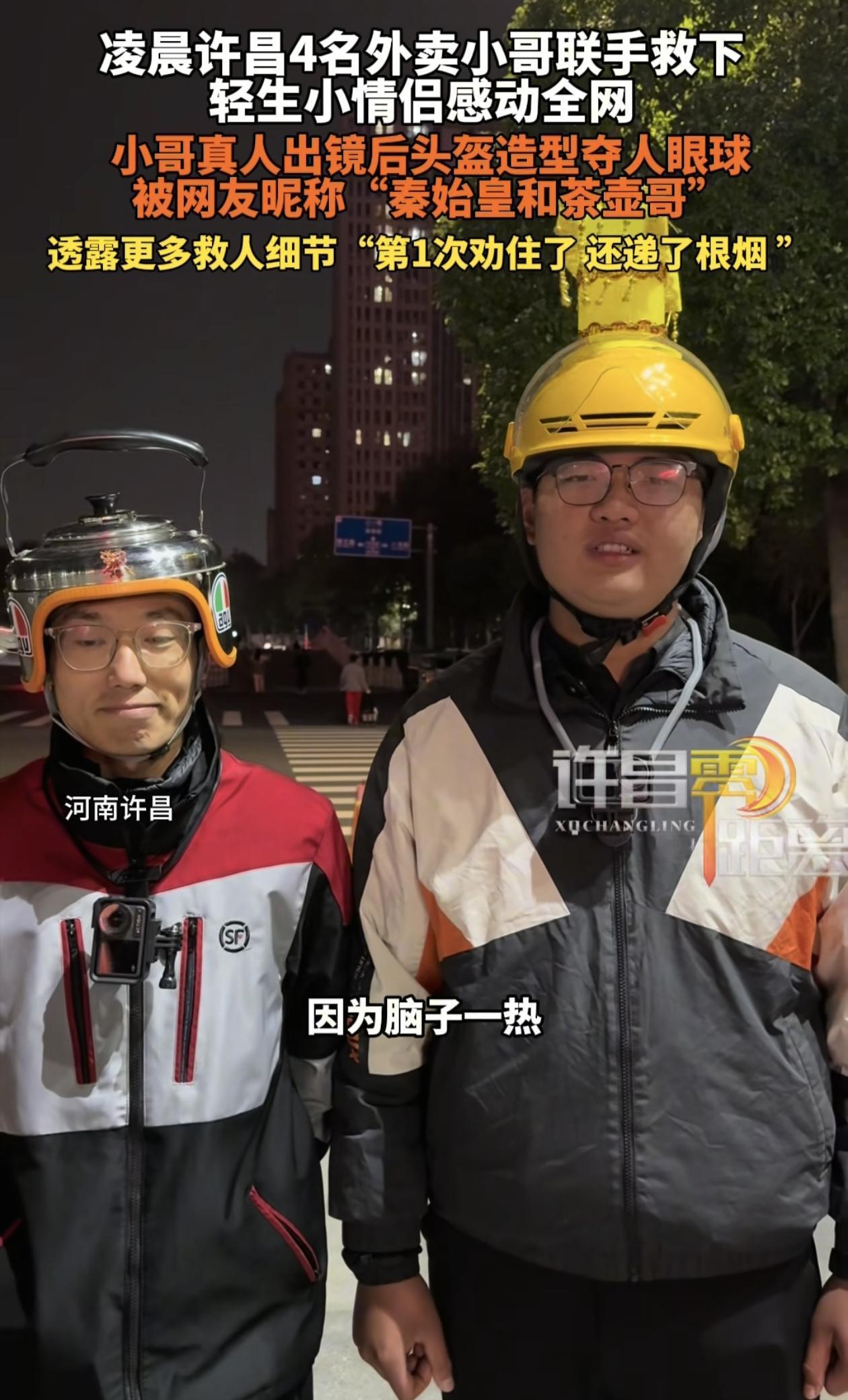 这个“壶”和“皇帝”帅呆了!河南许昌,四名外卖骑手在街边等单,旁边正好有一对情侣在吵架,四个人正看热闹呢,突然带着“皇帝帽”的小哥立马就追出去了。 四个小哥原本都在自己的外卖车旁聊天,旁边一对情侣因为一些事情吵了起来,四人想着人家小情侣的私事就都没有出面劝解。 过了一会,这对情侣的争吵声突然就小了,男主角竟然开始又脱鞋子,又脱衣服的往桥边跑了过去。 这时头戴“皇帝帽” 安全头盔的小哥立马反应过来男子可能要寻短见!一边追出去一边大喊:“壶,这个男的不对劲!不对劲!” 头戴水壶装安全头盔的小哥听见后也立马追着男子跑了过去,俩小哥拼尽全力拽着想要轻生的男子。 二人刚松口气回过头就发现女主角又突然跑到了道中间横躺!另外两名小哥又赶紧去将女子扶到路边。 后来有人报了警,将这对情侣都带走这场闹剧才结束。 网友评论 男的要跳河,女的躺路中间……留下崩溃的外卖小哥“你弄啥哩,你弄啥哩”锅和盖干仗,把壶忙够呛。 还有网友评论:外卖小哥这个团体真的是人才辈出! 老一辈总说:“少管闲事,免得惹麻烦”,可许昌这四位小哥告诉咱:有些“闲事”,总得有人管。要是他们当时怕麻烦、装没看见,后果真不敢想。 咱城市里的安全感,从来不是光靠“大道理”撑着,就是靠这些愿意“多管一步”的普通人:是看见老人跌倒敢扶的路人,是发现小孩走失帮着找的店主,也是像这四位一样,见人有危险就冲上去的外卖小哥。