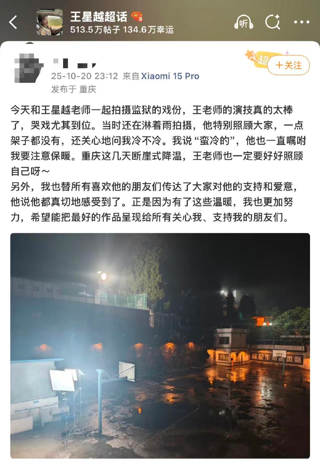 同剧组演员夸王星越王星越被剧组演员夸了 10月20日,有同剧组演员发文夸“王老师的演技真的太棒了,哭戏尤其到位。当时还在淋着雨拍摄,他特别照顾大家,一点架子都没有,还关心地问我冷不冷。我说“蛮冷的”,他也一直嘱咐我要注意保暖。”王星越[超话]