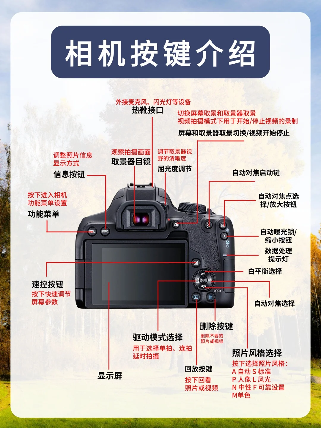 认识相机的按键:了解按键功能和作用 拍照模式的选择:M档,前期可以A档过渡 摄影基础知识 摄影入门 新手小白摄影 摄影教学 小白学摄影 大学生学摄影 摄影教程分享 拍摄技巧 摄影摄像 摄影的魅力 摄影新手教程