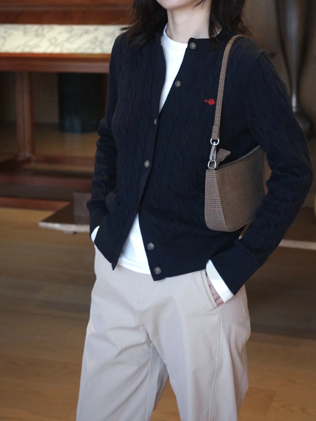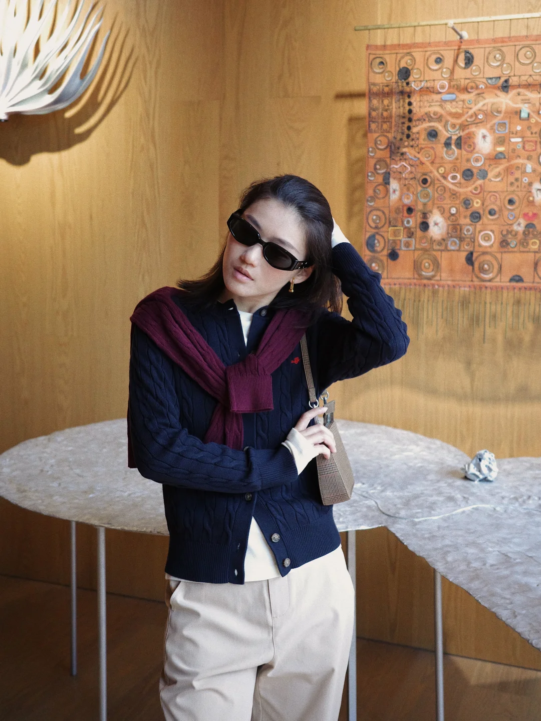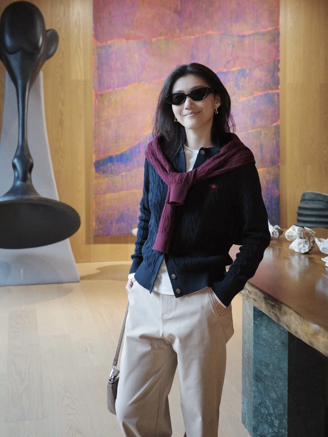 红色logo小刺绣,让这件复古开衫时髦了不止一点~