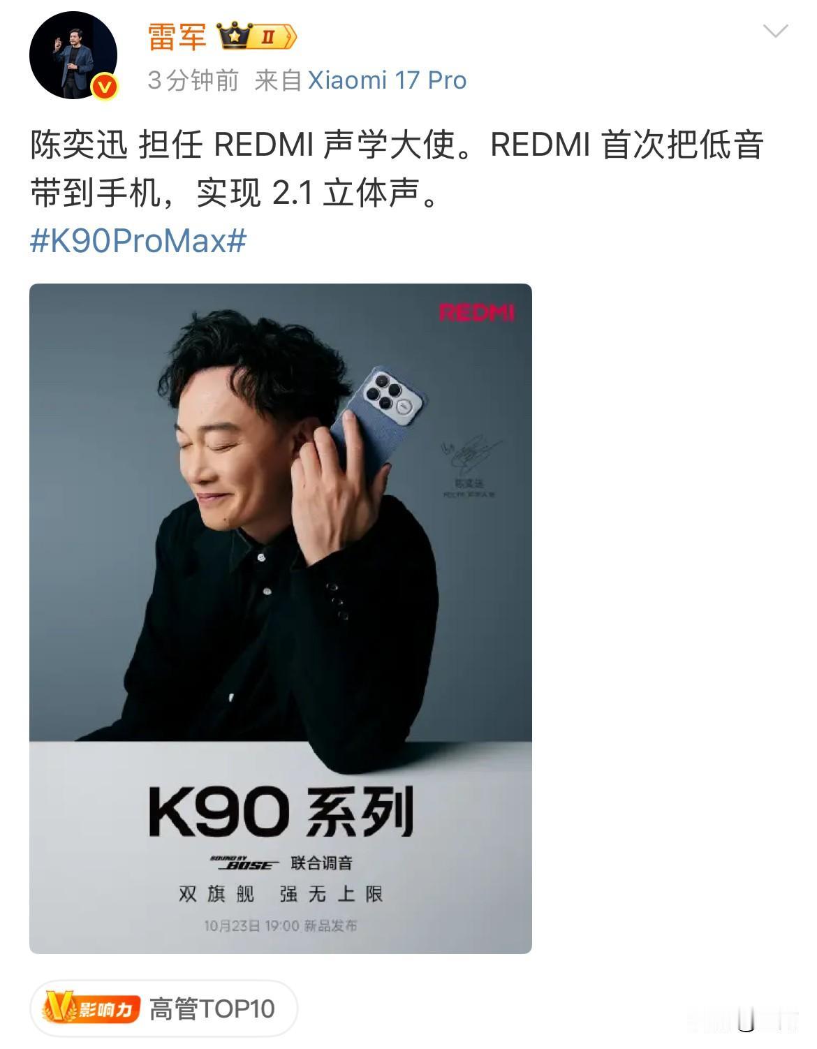 雷军:陈奕迅 担任 REDMI 声学大使。REDMI 首次把低音带到手机,实现 2.1 立体声。 就在刚才,雷军在个人的社交网络上放出了陈奕迅拿着手机的照片,通过他个人的社交网络,向大家释放出了这一位全新的红米手机形象代言人! 这次红米手机投入的推广力度,和以前相比好像又上了一个区间,当然有人说为啥他们一定要找陈奕迅,而不是之前的樊振东! 可能根本原因与这次他们推这个手机的音响有关系,因为他们一再强调,这个手机的音响,是重新定义了手机的声学! 而且他们也搞了好几个视频,向大家介绍他们与这个音响的合作伙伴,那就是博士音响,再加上陈奕迅又是资深的歌唱艺术家,所以他们两个这种一拍即合的效果还是有的。