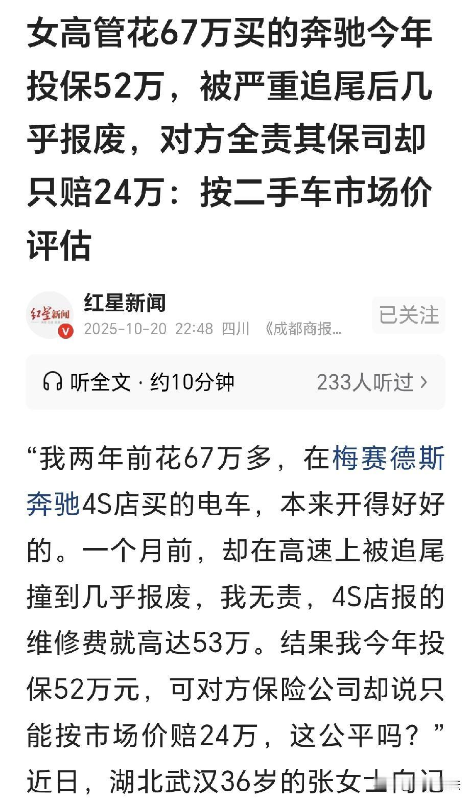 湖北武汉,一女子是某公司高管,2年前花67万,从奔驰4S店买了一辆试驾电车,今年3月,她按52万保额买了车损险,谁知8月底她在高速上正常行驶,突然被一辆车追尾,撞得女子车辆几乎报废,警方判对方全责,可对方保险公司只愿赔24万,这中间近30万的差额,让她实在无法接受。 8月31日下午,张女士开车从河南回武汉,谁知走到G0424京武高速黄陂区段时,突然被后方车辆从中间车道追尾。 张女士还没反应过来,车辆就被撞到了应急超车道,接着又掉头撞上路边的护栏。 张女士头晕目眩,她愣了片刻,连忙下车一看,她顿时惊得目瞪口呆。 她的车辆,被撞的面目全非,右后方缺了一大块,充电口露在外面。 左后方更加严重,电机露了出来,张女士看的心疼,她又绕到车头观看,车头被撞的变形,就连安全气囊都爆了3个。 不幸中的万幸,张女士本人倒没大事,她只是轻微脑震荡,外加受到了一点擦伤。 张女士欲哭无泪,站在路中间泪如雨下,警方迅速赶到现场处理,经过勘察,判定张女士无责,对方负全责。 张女士以为,既然责任清晰,就能及时获得足额的赔偿,谁知她万万没有想到,她遇到了巨大麻烦。 原来,张女士在一家奔驰店里有熟人,这辆车是通过熟人买的一辆试驾车。 买车时省了好几万元,购车发票上写着的购买金额是675552元。 张女士签了试驾车转让协议,本以为这个价格,十分的划算,可谁也预料不到,2年后竟然被追尾了。 通过4S店估算,按照损坏的程度,这部车如果维修,维修费超过52万。 但张女士今年3月,才在A保险公司买的车损险,保额是520410元,但基本可以按照全险处理。 张女士本来以为,自己无责,完全都是对方责任,理赔能够顺利赔偿,谁知对方的B保险公司,给出的理赔金额只有24万。 对方给出的理由是: 这价格是按照二手车市场价评估出来的。 这个差额太大,张女士坚决不能接受,她想不明白,明明不是自己的责任,为何要承受这样大的损失? 张女士表示:我今年3月才按52万买的保险,8月就出事了,凭啥不能按保额赔我? 之后,张女士申请代位追偿,先让自己投保的A保险公司先把钱赔给她,再由A公司找B公司进行追偿。 可A公司表示,张女士要求代位追偿,那赔偿额也得在B公司认可的金额范围内才行。 如果A公司多赔超额,后续再找B公司追偿,但B公司不认可,那么多出来的赔偿款,可能就要不回来了。 张女士陷入了困境,也就是说,A公司没办法全额赔偿。 B公司理赔员说,张女士的车是从4S店转让来的,有过户记录。 因此这辆车就是二手车,全损理赔只能按二手车算。 24万的价格,是B公司理赔员从报价系统查的同款二手车市场价。 B公司理赔员还说,这价格能谈,但张女士不愿协商。 B公司理赔员又说,保险理赔时只能看事故发生时车的实际价值,而不是按照新车价计算的。 对于张女士的心情,理赔员表示理解,她想换新车,但这款车现在说不定都不生产了。 至于试驾车到底算不算是二手车,B理赔员认为,只要所有权从单位转到个人,就算二手车。 赔偿的核心是要看事故发生时车辆的实际价值是多少。 关于此事,一句话就说透了:如果走自己的A保险办理全损,就是保多少赔多少;如果走对方的B保险办理全损,就是值多少赔多少。 张女士找到记者,记者问了几家保险公司,发现问题根本没张女士想的那么简单。 车损险保额是按发票价乘以折旧系数算的,根本不看实际车况。 也就是说,张女士花了67万多买的近3年的试驾车,买保险时,保额定了52万。 可是,如今真出事了,对方保险公司按二手车市场价一估,价值只有24万。 可张女士认为,自己花67万买车,又按52万保的险,这俩数字就应该是车的价值 ,自己无责,却要承担一半损失,这样的处理,太不公平。 但B保险公司,是按《保险法》里的损失填补原则来赔偿的,是为了让被保险人回到出事前的经济状态,而不是让她赚钱,所以得按二手车市场价算。 而A保险公司定52万保额,是按张女士承保时的参考价值,也就是新车价折旧后的数额算的。 可52万的价值,真正到了理赔时候,很难被当成实际价值的证据。 所以A保险公司也不敢轻易全额赔偿,怕后续追偿失败。 《民法典》第1184条规定: 侵害他人财产的,财产损失按照损失发生时的市场价格或者其他合理方式计算。 张女士的车辆因对方全责受损,B保险公司按事故发生时的二手车市场价定损24万,符合“损失发生时市场价格”的核心要求。 尽管张女士购车价67万、保额52万,但前者是过往交易价,后者是承保时的折旧参考价,不能替代事故发生时车辆的实际市场价值。 若A公司超额赔付,后续向B公司追偿时,超出实际损失的部分难以得到法律支持。 若张女士不认可,可以找第三方鉴定公司估值,先和对方进行协商,也可以去法院起诉。 关注@王哥说法 多学法律少吃亏!