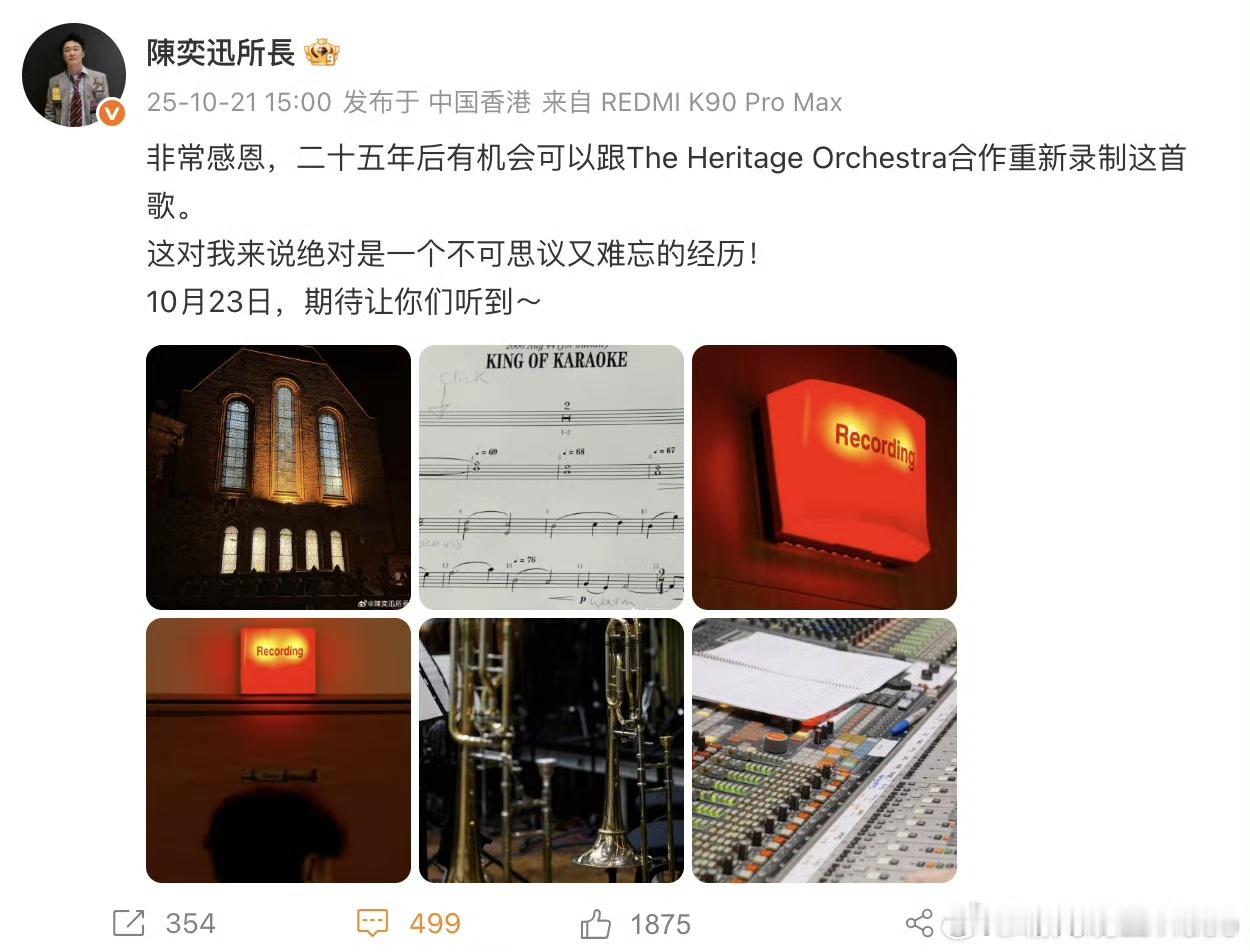 陈奕迅时隔25年重录K歌之王 10月21日消息,时隔25年,陈奕迅将重录《K歌之王》。也在个人微博回应:非常感恩,二十五年后有机会可以跟The Heritage Orchestra合作重新录制这首歌。这对我来说绝对是一个不可思议又难忘的经历!10月23日,期待让你们听到~你期待重录版的《K歌之王》吗?