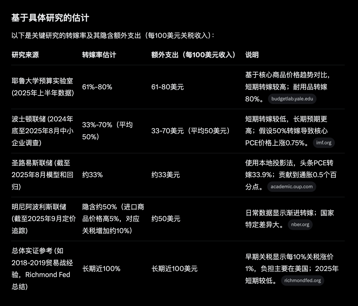 所有西方知名研究机构认为关税对于国内物价的转嫁率,大概是 3 -8 成。粗暴的平均为 5 成则意味着: