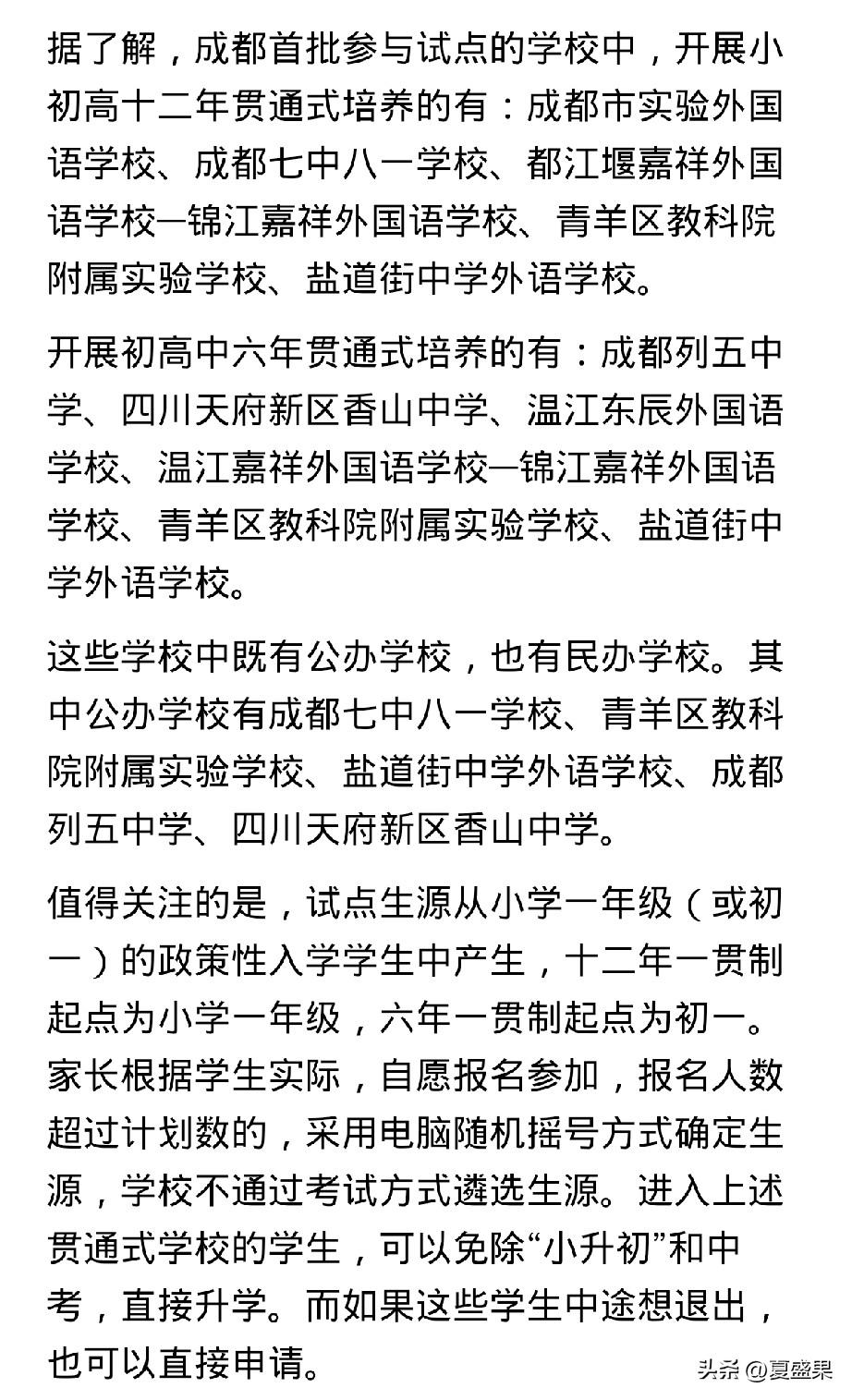 成都开好头了, 以后不再有小升初和中考,因为十二年贯通制学校来了。 最近成都多所