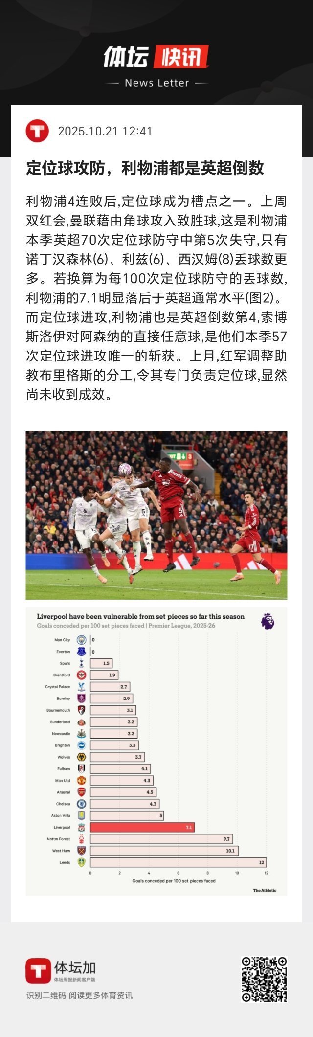 若换算为每100次定位球防守的丢球数,利物浦的7.1明显落后于英超通常水平(图2
