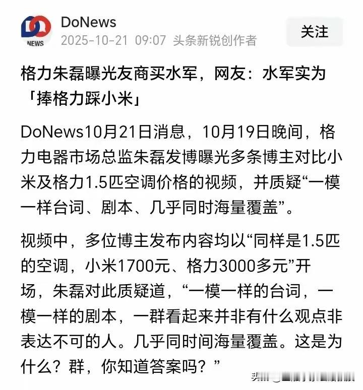 格力朱磊这次发文闹笑话了?昨天格力高管朱磊发文直接贴证据称,同一模板同一时间段海量发布,皆为比较格力和小米空调的视频,意思很直白,就是指责对方用水军黑格力。 但是细心的网友却发现,这些视频看完后并不是踩格力的,而是赞格力踩小米的,剧情一下子反转了,朱磊误伤自己人了,显然作为市场总监,拿到的证据自己没有检查就贴上发文,确实比较草率,不知道是朱磊个人所为还是手下工作不仔细闹了这个笑话,也让大家知道这个家电行业要回到踏踏实实做自己的事情确实不容易啊!