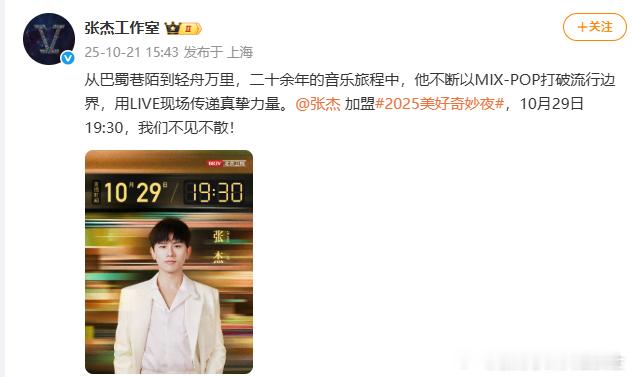 张杰加盟2025美好奇妙夜张杰用LIVE现场传递真挚力量2025 美好奇妙夜有张杰了!他曾用喇叭清唱掀万人合唱,这次仍会用 Live 传递真挚力量。