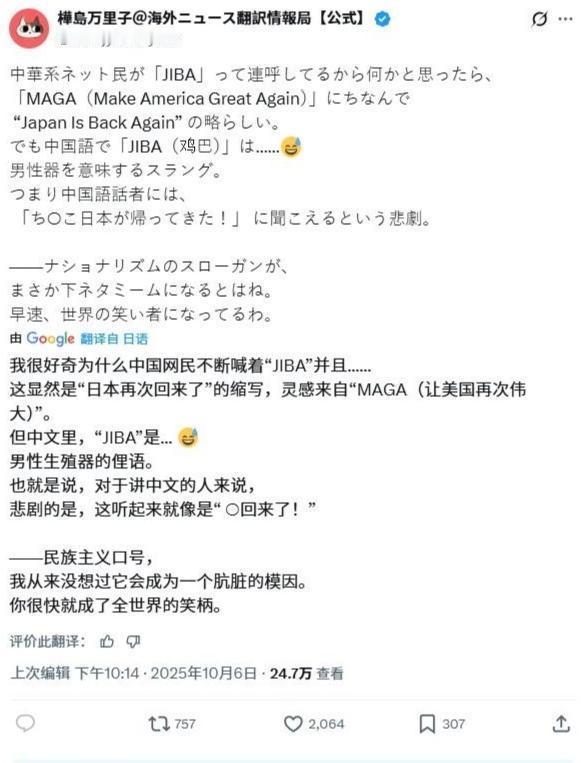 高市 早 苗的竞选口号是“JIBA”,这位日本大妈不是反 华吗。对中国这么不了解? 高市 早 苗的竞选口号出来了,“Japan is Back again”,“让日本重返巅峰”,简称JIBA,在中文里这是啥意思不用解释了吧(吉爸)! 想象一下,这位长相怪异的日本大妈带领着她成千上万的支持者,高呼口号,“JIBA!”这得是一个多么诡异、滑稽的场景。 当然这句口号不是针对中国人使用的,可您老人家不是反 华吗?所谓知己知彼,您不该考虑一下“JIBA”中文语境的意思吗?闹出这样的笑话,也太不专业了吧!