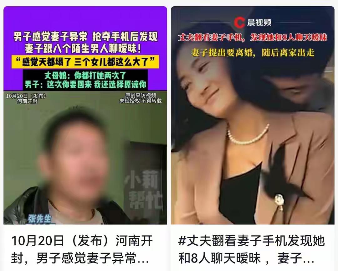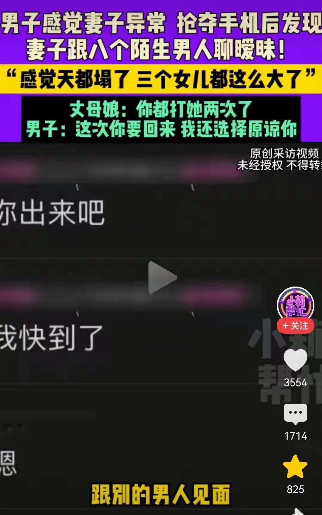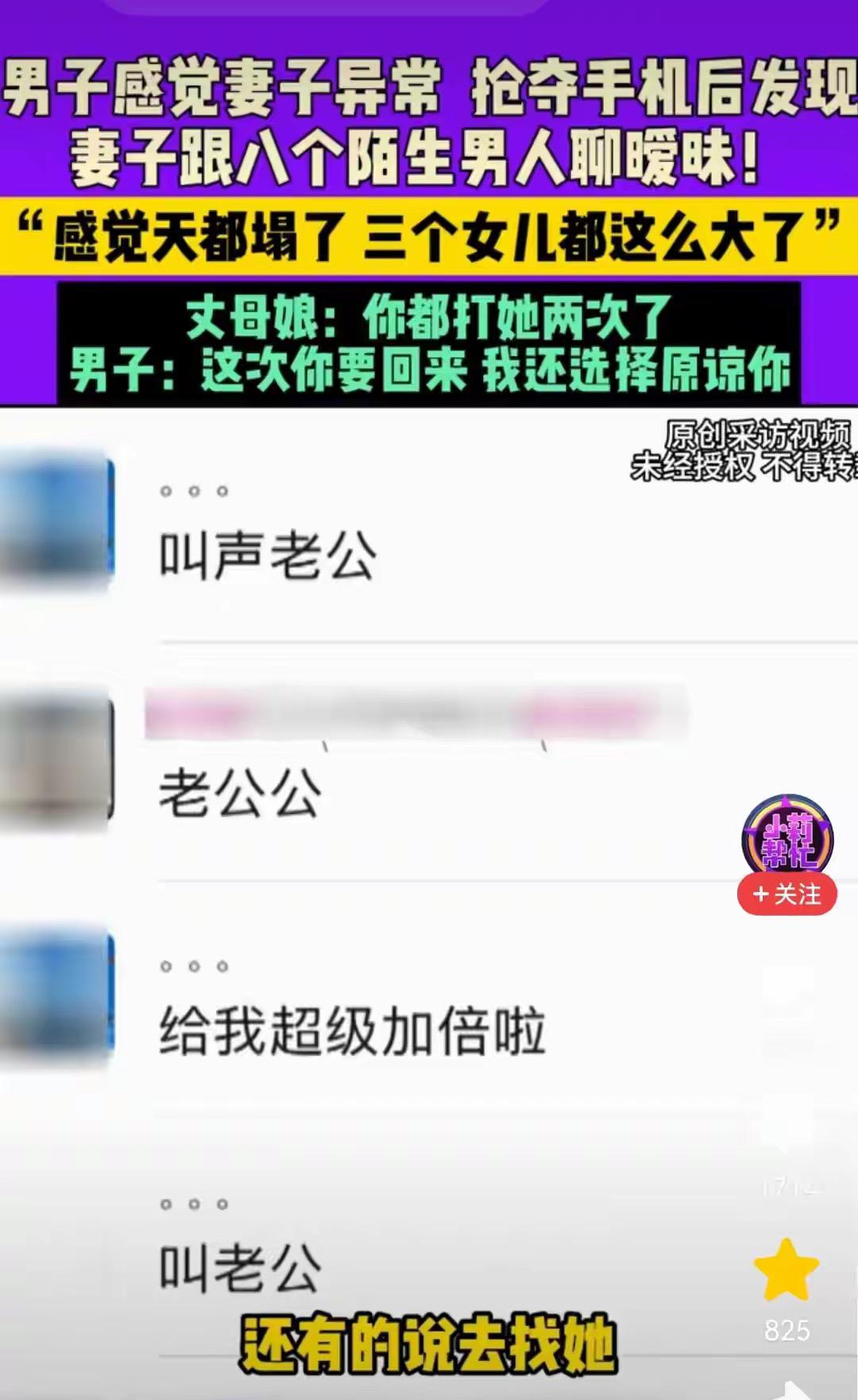 太炸裂!3个月跟8个男人搞暧昧并出轨,最后丈夫做法更意外 真是大吃一惊,一个三个孩子的母亲,居然在三个月之内,跟8个不同的异性暧昧,而且有的还相约见面,甚至提到去宾馆,跟8个人都发展到了什么程度他老公也不清楚。 该男子长期在外打工,由于近期发现老婆行为异常经常手机不离手,跟对方聊天有说有笑,男子心里起了疑心,要求查看妻子手机,妻子不同意随后两人扭打争夺手机,最后男子看到妻子的手机傻眼了,竟然跟八个男人搞暧昧,而且有的已经见面了,男子便质疑老婆为什么这样对他?老婆便提出离婚,随后离家出走,不见踪影。男子寻妻心切便请了媒体帮忙寻找他妻子。 男子面对媒体伤心的说承认自己的错误,不该看妻子手机,这些年出去打工挣钱而忽略了她,她向妻子道歉,怎么多年忽略她的感受。 男子说他妻子之前出轨被父亲看到,自己曾动手打过妻子,但妻子保证了不出轨了可是没做到。 男子太软弱了,妻子多次频繁出轨都能原谅,你是多缺女人呀?男人应该有点骨气,太卑微了反而让妻子感觉离不开她,更会肆无忌惮的不顾及老公的感受去搞婚外情。这种女人不值得给她道歉,直接把她扔出去,一刀两断,她爱糟蹋自己就随她去,自己努力把孩子养大成人,孩子也会感激你的。婚姻内出轨 出轨男人心理 婚外情 婚外关系 家庭婚外情 婚外恋征兆 中年男人婚外情