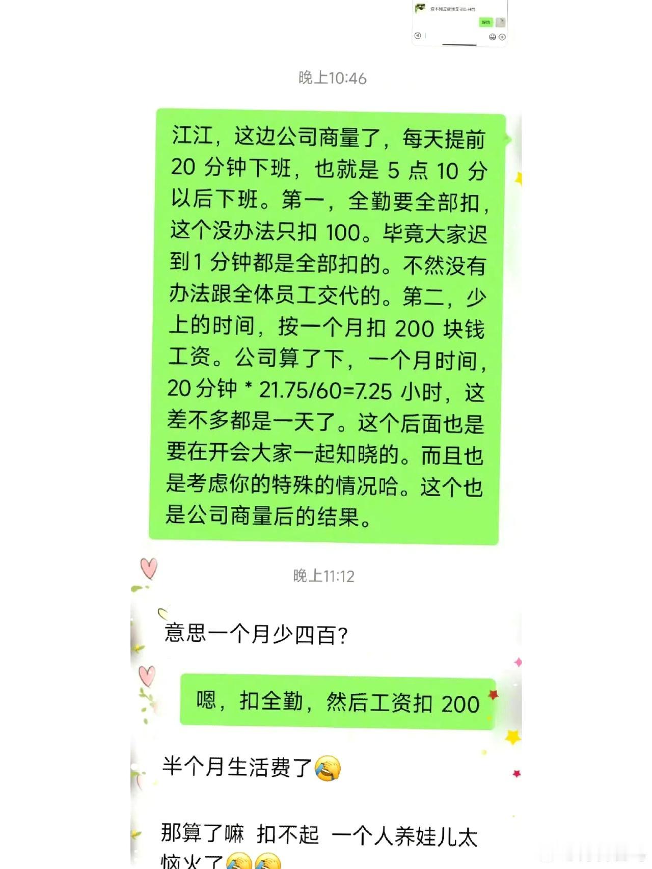 员工提出想法,想每天提前20分钟下班接小孩,结果你猜怎么着? 现在很多家庭都有这种情况,小孩放学没人接?或者学校经常要求家长工作日参与一些活动。 这就导致很多家长要经常请假,如果一个月偶尔一两次还可以,多了领导也不愿意。 而其中接孩子放学就是一大难题,学校放学早,家长六点才下班,这孩子让谁接? 然后就有一位家长向公司反应说因为要接娃,看能不能全勤只扣一百,然后每天提前20分钟下班? 这种事情公司肯定不允许,毕竟这头也不好开,告知全勤200肯定是要扣的,如果真的每天要提前20分钟下班,那就要再扣200元。 这一前一后400元没了,每月工资才3000,这一扣确实不划算。 按照公司来说,这也算仁义了,毕竟还允许提前20分钟下班,换作其他的,估计直接拒绝了。 可是如果不提前下班,孩子又要找谁接?这也是一大难题呀!