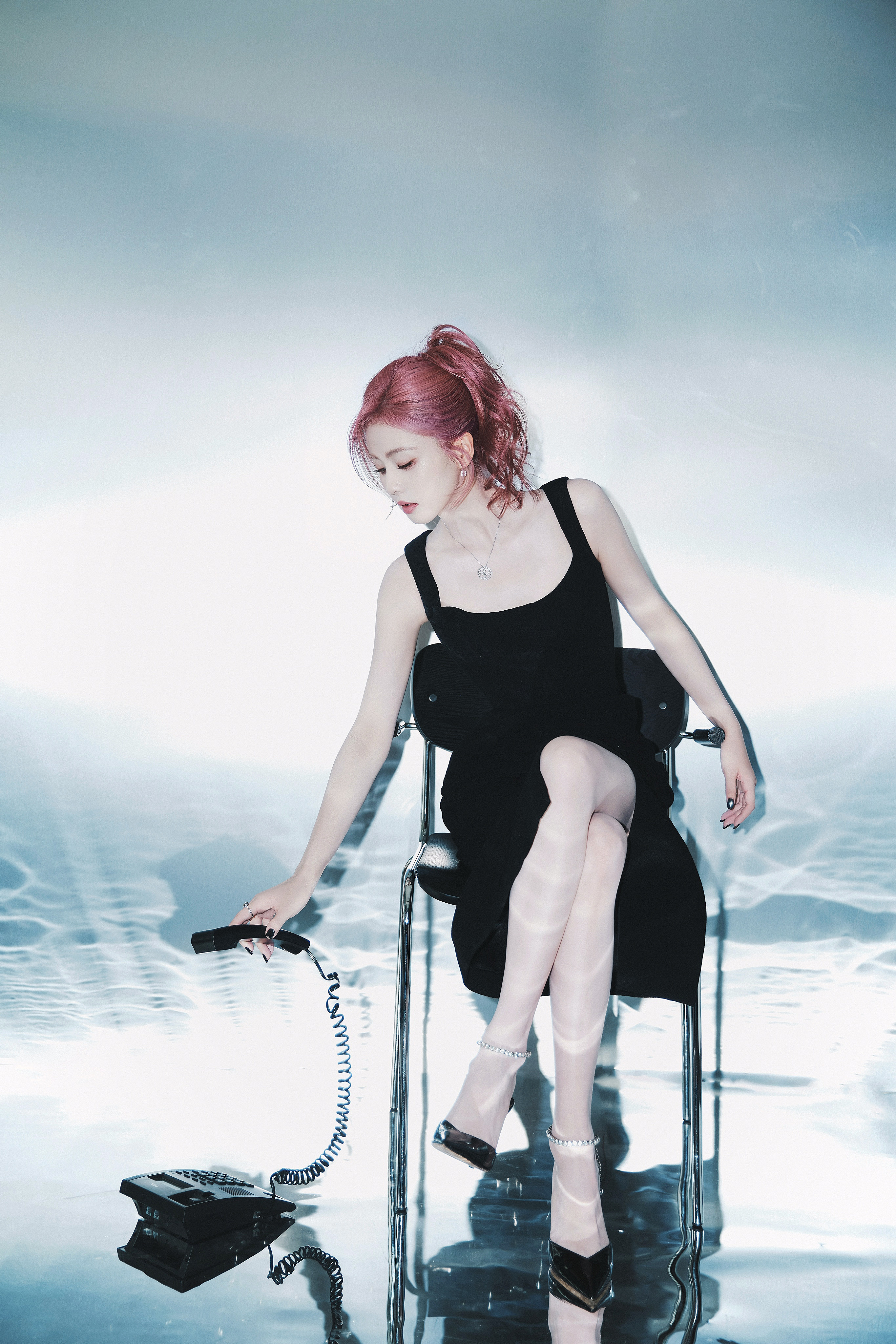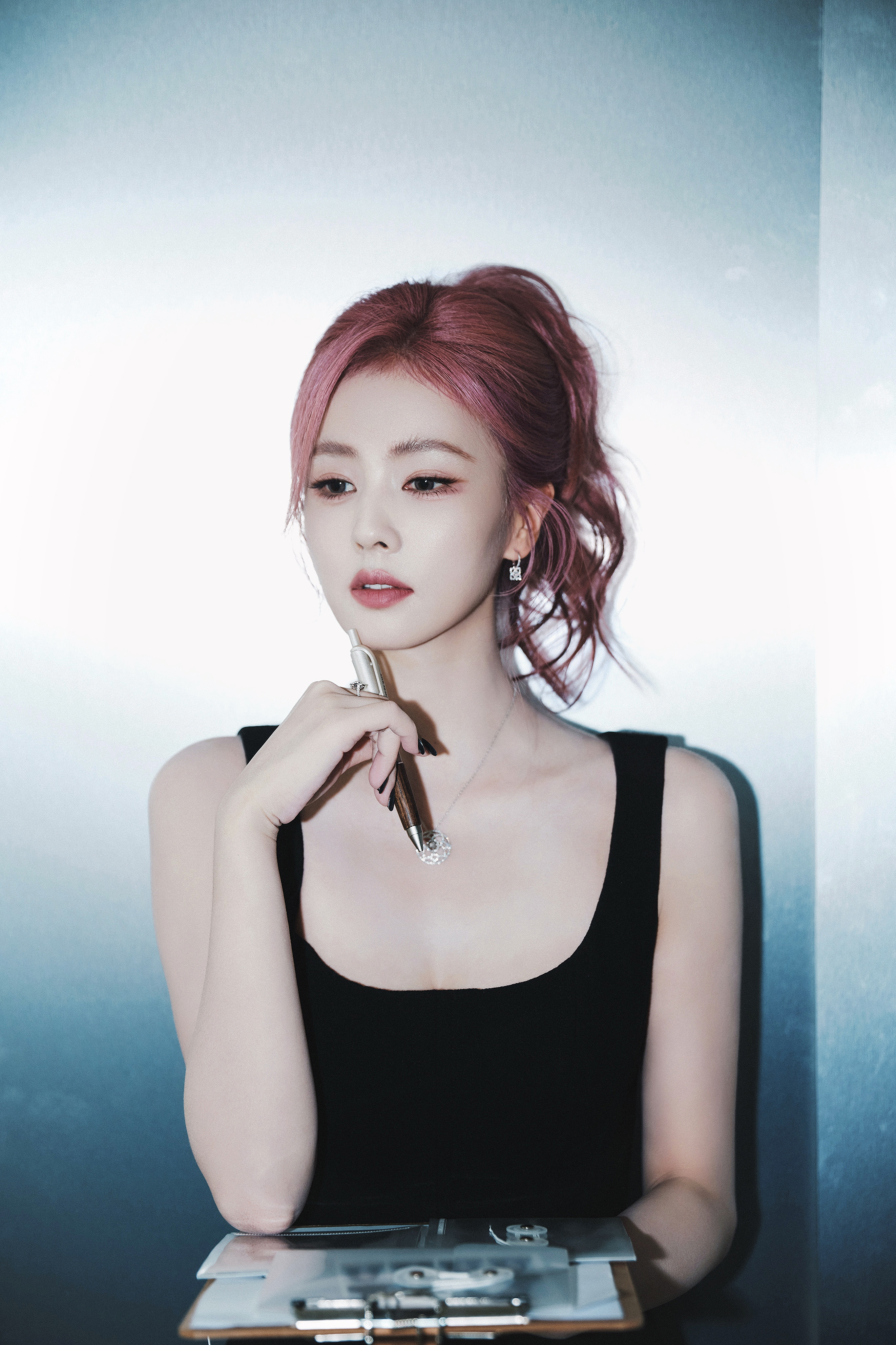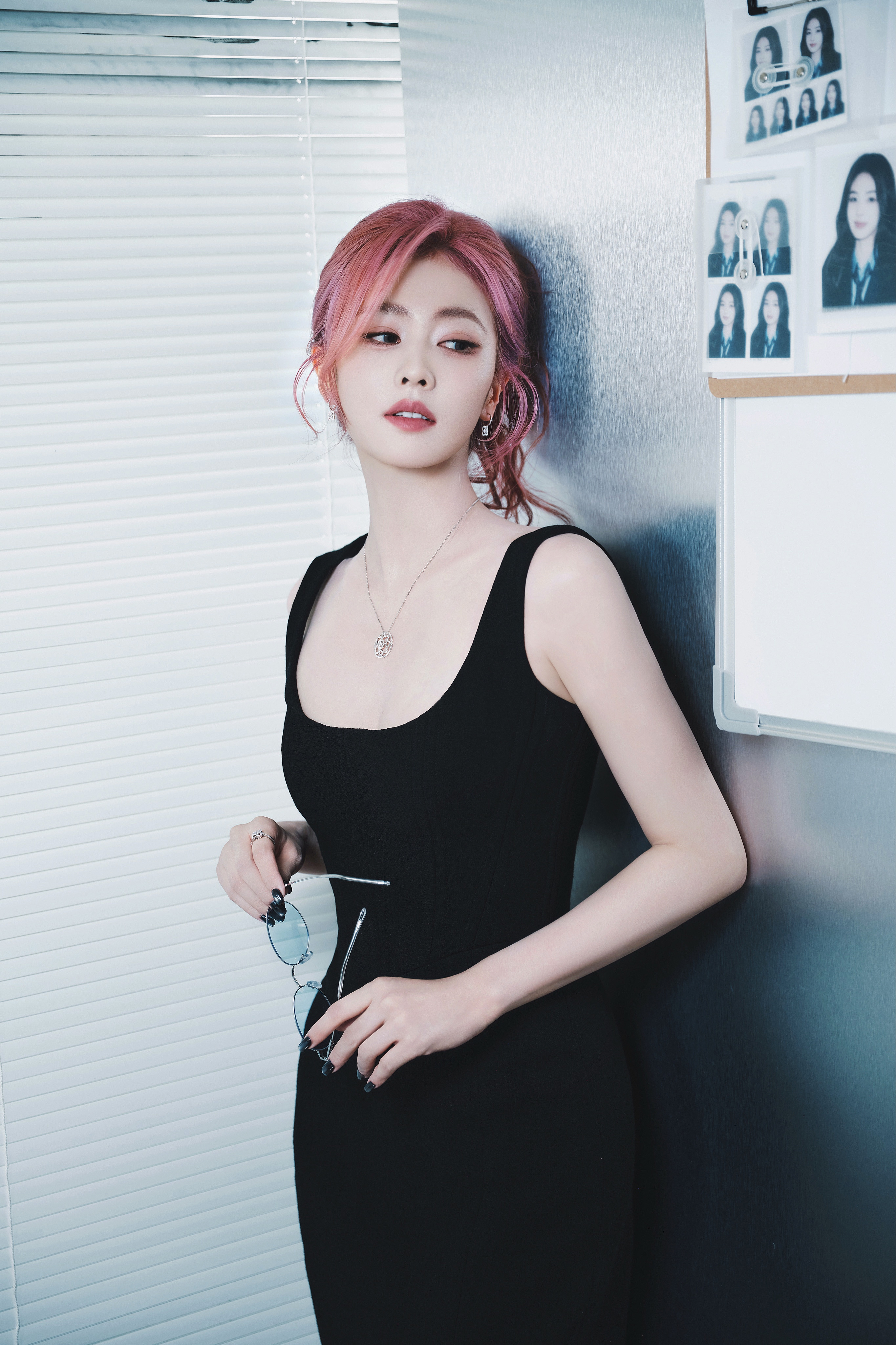 白鹿一身黑裙勾勒出随性与精致的边界,粉发似揉碎的晚霞,在纯白空间里晕染出独属于