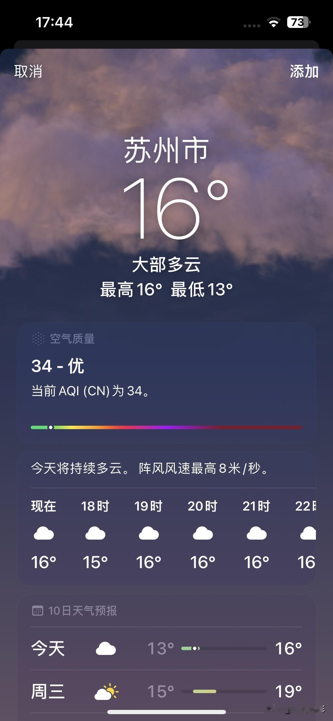 苏州这天气变化太大了,如同过山车哐当一下到了冬天。 还以为体验一下秋高气爽的感觉,看样子体验不了了。 前天穿短袖,今天一下给干到穿棉袄,气温直接跌到10多度左右,看这天气让人琢磨不透。 接下来真的要洗洗刷刷,凉凉晒晒,把空调被收起来了,换上棉被了。 着实希望苏州冬天是个暖冬! 苏州天气预报 苏州秋天 苏州城市风光 江南美景苏州 苏州气候 苏州
