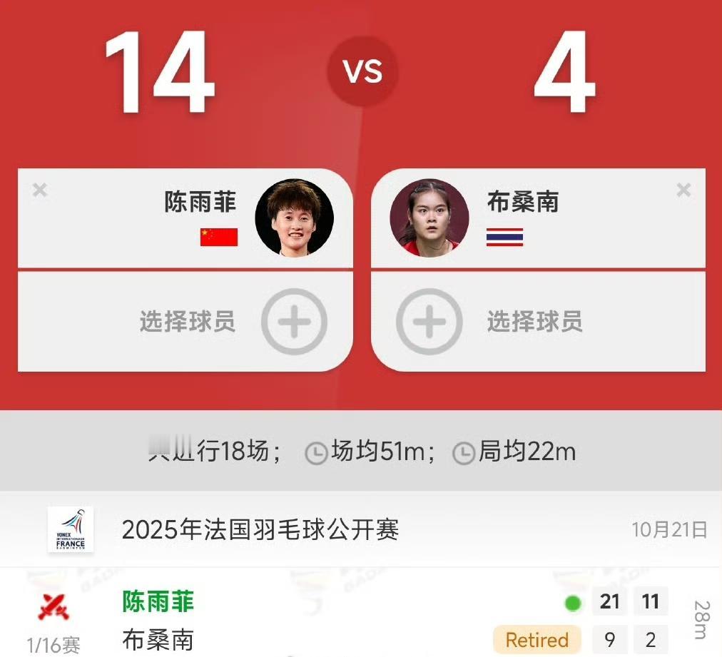 陈雨菲🇨🇳晋级女单16强! 刚刚,第一局陈雨菲🇨🇳 21-9胜了泰国选手布桑兰🇹🇭,第二局比分来到11-2 时,🇹🇭布桑兰退赛,从而陈雨菲轻松晋级2025年法国羽毛球公开赛女单次轮比赛,这也是陈雨菲四连胜布桑兰。 今天感觉菲菲的脚步比丹麦羽毛球公开赛时候好一点了。 下一轮:陈雨菲🇨🇳 vs 🇹🇷伊吉特!