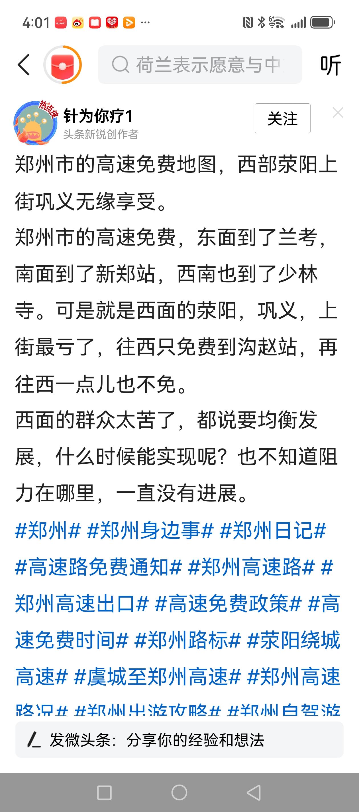 荥阳过境高速为什么不免费?主要是城北连霍高速和城东郑云高速(郑州绕城高速),借郑州绕城之力其科学大道,郑上路,中原路,陇海路,郑少高速,樱桃沟高速口都对䂊A/V车牌免费,就是说荥阳不需出一分钱就可享高速免费!但也只是对城关,豫龙,贾峪三镇有作用。过境郑云高速广武收费口,连霍高速高村镇,虎牢关收费口对豫A/V还都不免费,荥阳不想补贴。可看看郑州周边中牟,新郑,登封,新密过境高速从A/V郑州市区到所辖县市各地高速口都免通行费,我想荥阳也别自行其事一直被别县市诟病!最大好处对自己汜水,高山,王村,高村,广武几镇发展有好处!也不让中牟,新郑,新密,登封人老说荥阳车跑人家地方都沾光!开了吧,巩义也会跟上,舍得几个过路费,可能迎来大扩张!