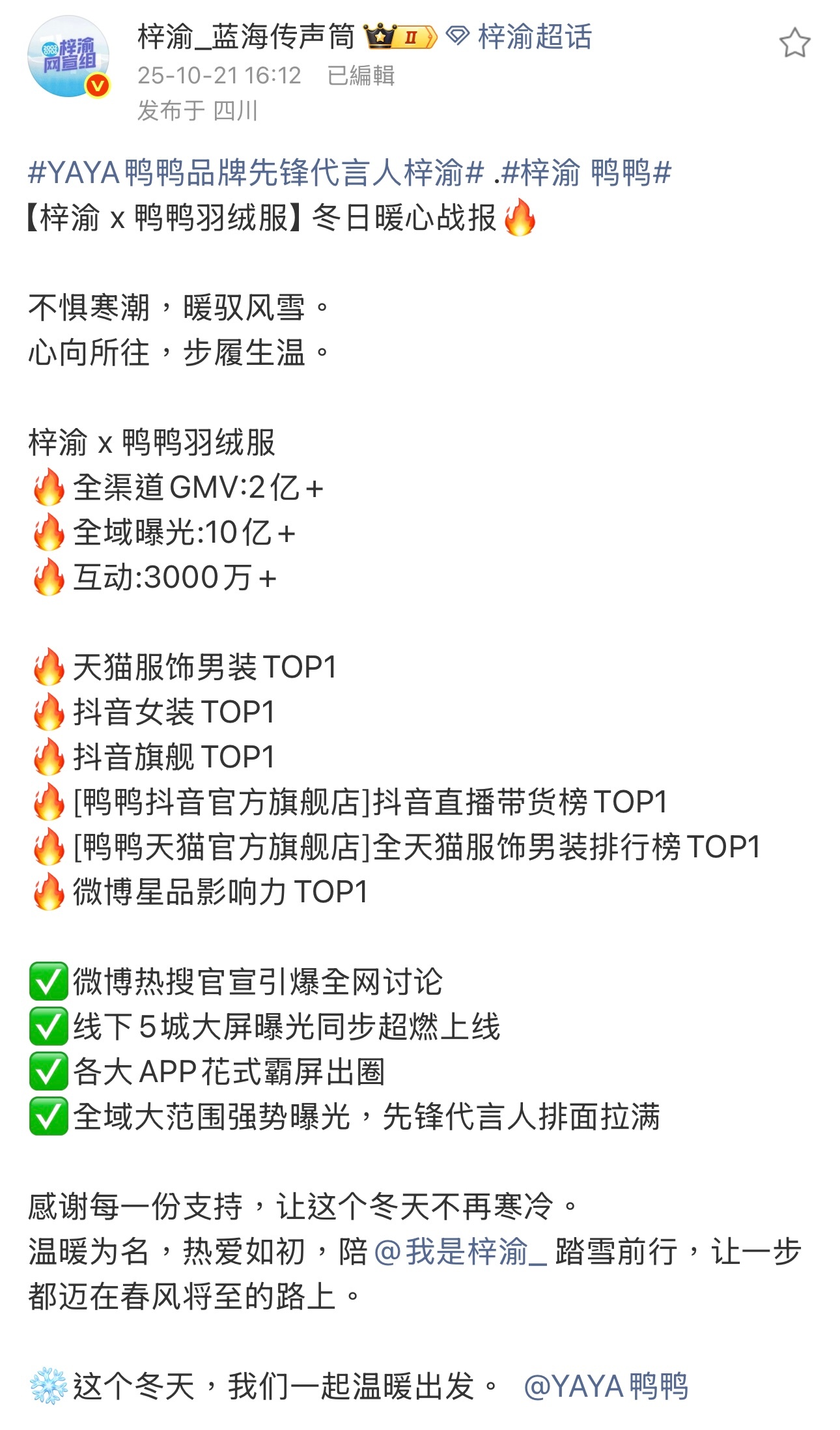 梓渝鸭鸭战报震惊到我了,全渠道2亿+,从来没有想过的一个数字,知道梓渝红,没想到红成这个样子,商界对他评价高不是没有原因的,恭喜梓渝! ​​​