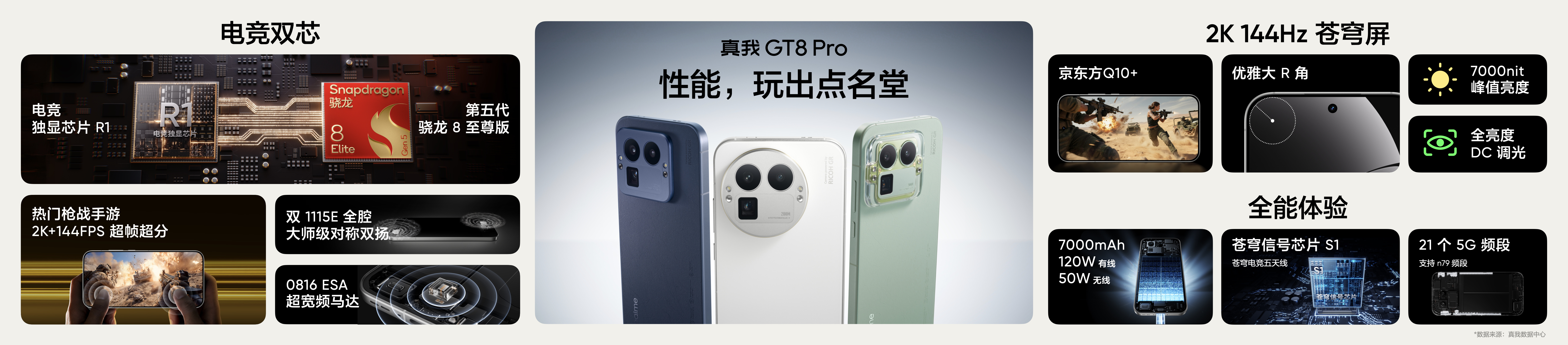 真我GT8 Pro屏幕、续航和网络:搭载了一块京东方定制2K 144Hz直屏,Q10+发光材料,全亮度DC+圆偏振光护眼+1nit极暗显示。7000毫安时电池,120W有线快充+50W无线快充,还有苍穹信号芯片S1,支持21个5G频段。怎么样?