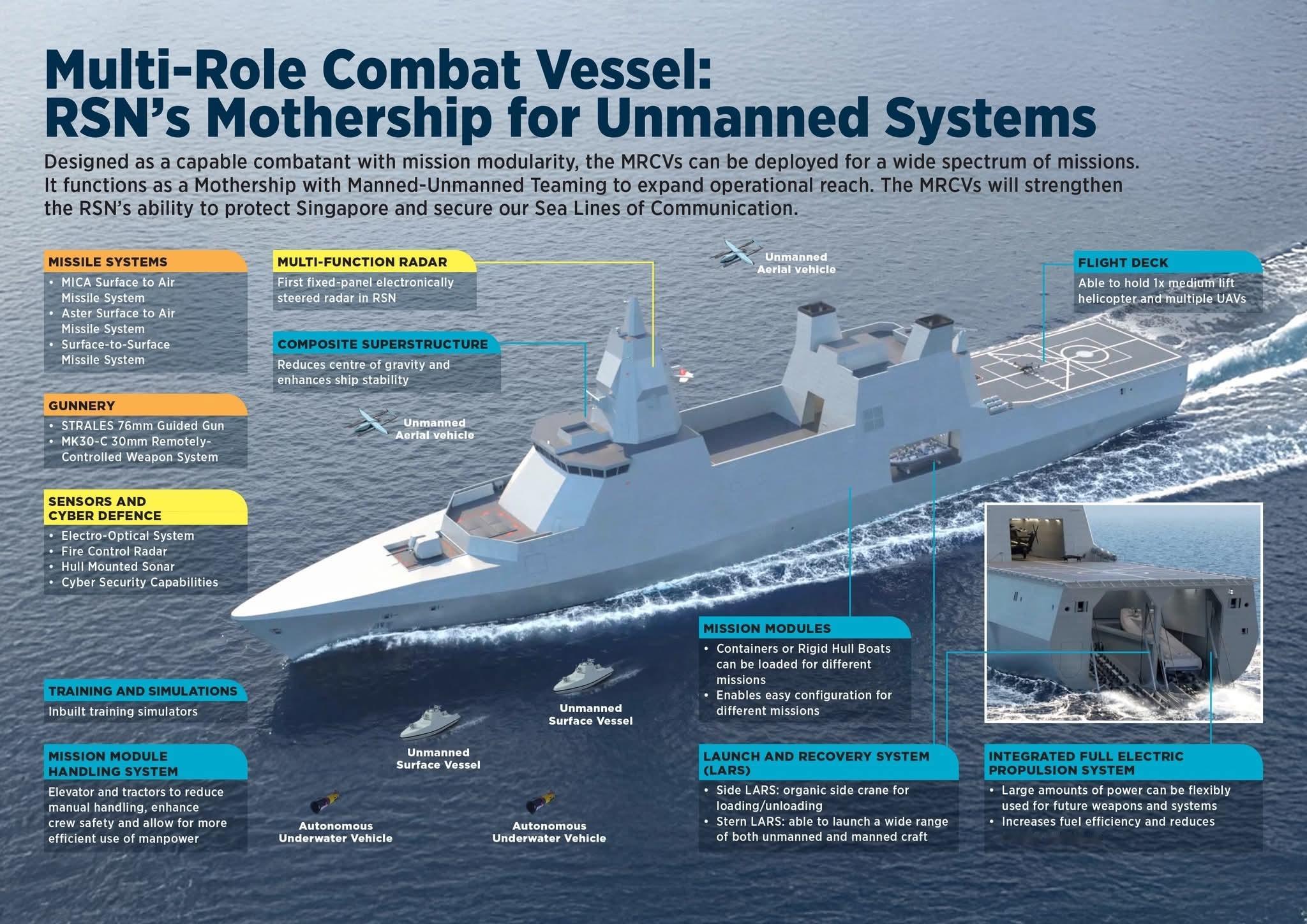 今天下水的新加坡海军“胜利”级多用途巡逻舰(MRCV)首舰“胜利”号(88),长150米,航速超过22节,续航力超过7000海里,排水量为8000吨,采用综合全电力推进系统,由柴油发电机驱动电动机,并通过高压电网分配动力,可连续执行任务21天,“胜利”号是一艘无人母舰,能够投射无人机、无人水面航行器、无人水下航行器。MRCV 配备了 Strales 76 毫米制导炮、Mk30-C 30 毫米遥控武器系统以及 Mica 和 Aster 舰对空导弹,未来可能部署每天认识一件兵器烽火问鼎计划