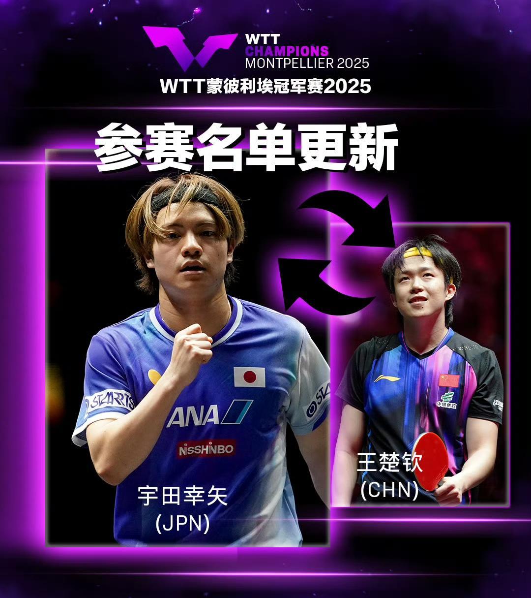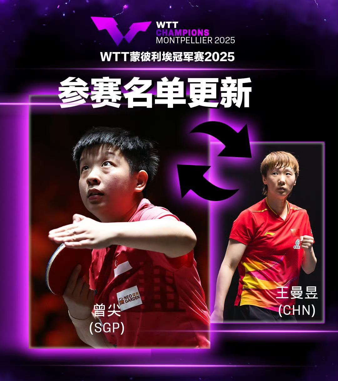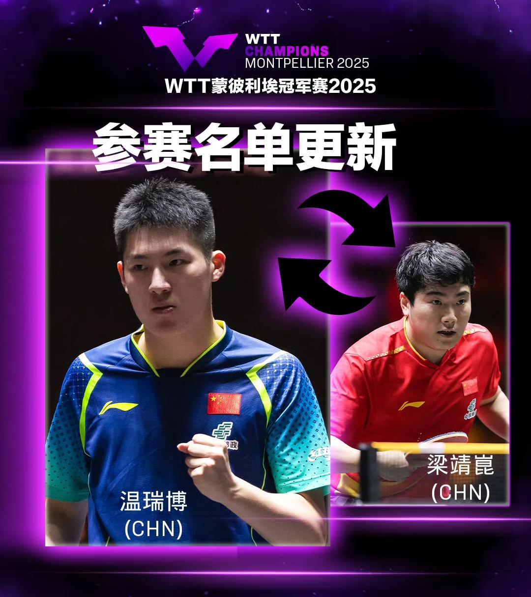 中国队五大主力全部退出WTT蒙彼利埃冠军赛! 中国队最终参赛名单: 男单:向鹏,陈垣宇,温瑞博 女单:陈幸同,蒯曼,王艺迪,陈熠 中国队五大主力退赛后只派出温瑞博递补,其他递补名额由外协队员补上。 到目前为止,王楚钦,林诗栋,梁靖崑,孙颖莎和王曼昱他们五人已退出今年仁川和蒙彼利埃两站冠军赛了,按WTT规则,运动员是有权选择性退出两站冠军赛的(不罚款不赋零分),但下一站法兰克福冠军赛时间跟全运会有冲突,中国队运动员也是没办法参加的(WTT法兰克福冠军赛11月4日至9日举行)。 运动员连轴转太辛苦了,支持他们退赛。全运会乒乓球项目将在11月7日开赛,他们也该各自回省队备战了。