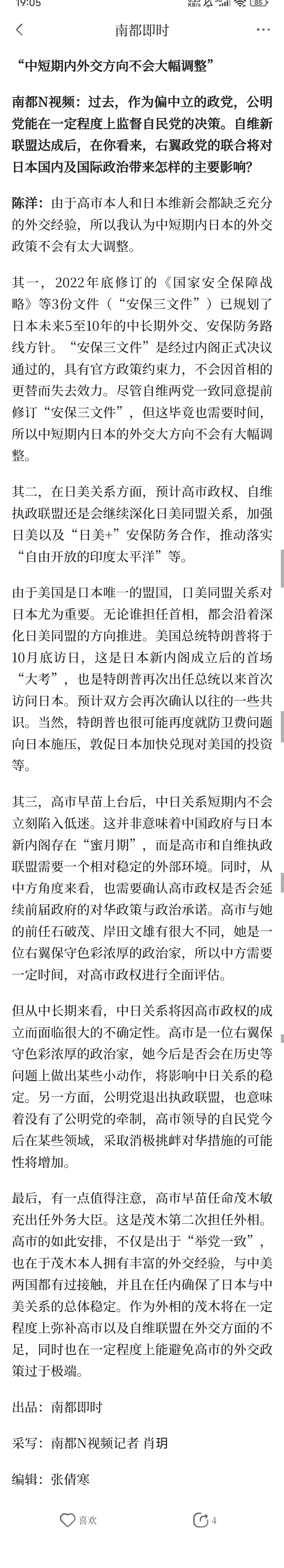 #高市早苗执政联盟面临不确定性#【专家分析高市早苗首相之路:新执政联盟基础不牢面临不确定性】#日本外交中短期内或不会大幅调整#10月21日,在日本众议院首相指名选举第一轮投票中,自民党总裁高市早苗获胜,当选日本新一任首相。这位出生于普通家庭、早年学习成绩优异的政治女性,在以高龄男性为主的传统日本政坛中脱颖而出,接替石破政权,这在日本政治史上尚属首例。