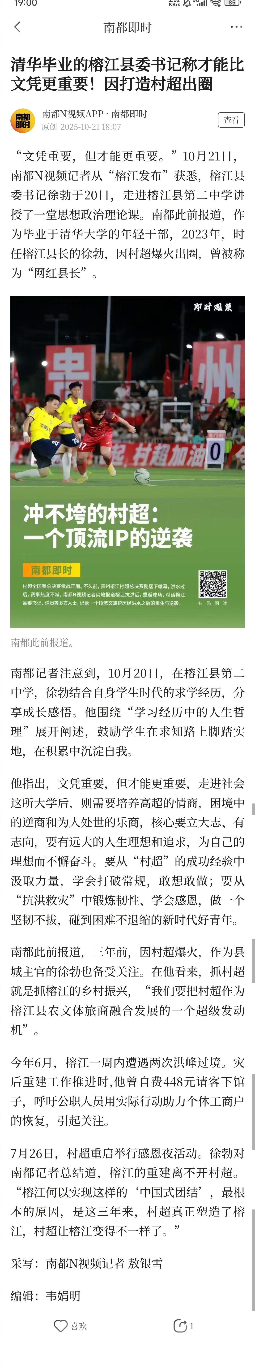 #清华毕业的县委书记称才能比文凭重要#【清华毕业的榕江县委书记称才能比文凭更重要!因打造村超出圈】#榕江县委书记走进中学讲思政课#“文凭重要,但才能更重要。”10月21日,南都N视频记者从“榕江发布”获悉,榕江县委书记徐勃于20日,走进榕江县第二中学讲授了一堂思想政治理论课。南都此前报道,作为毕业于清华大学的年轻干部,2023年,时任榕江县长的徐勃,因村超爆火出圈,曾被称为“网红县长”。