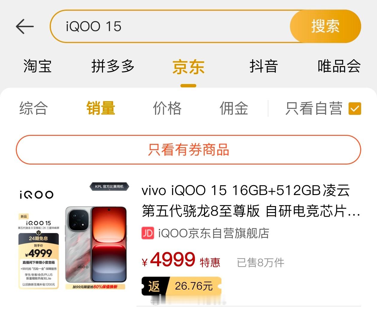 iQOO 15首发销量,京东直接8万+(昨晚是显示10万+)