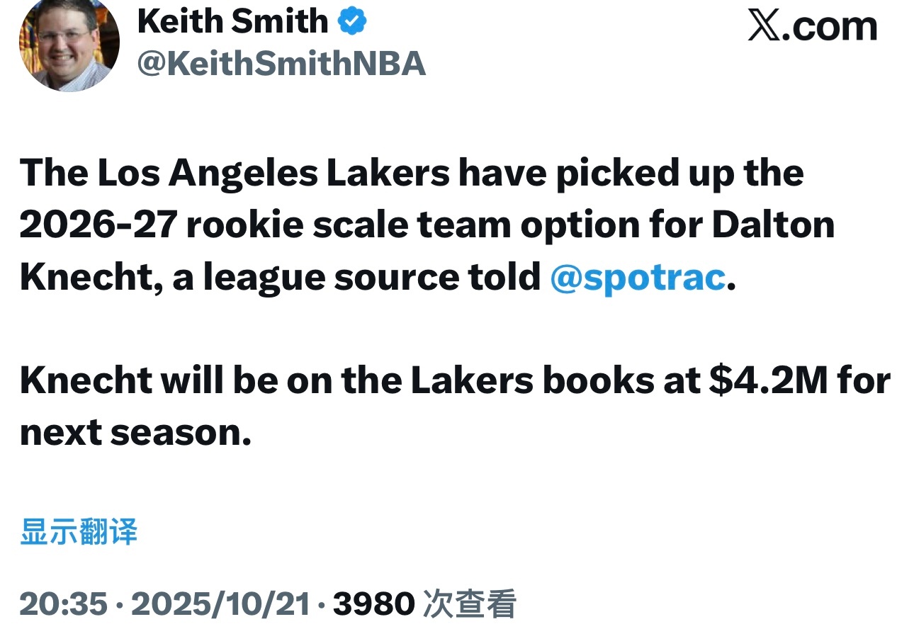 Spotrac记者Keith Smith:湖人决定执行克内克特2026-27赛季价值420万美元的球队选项。
