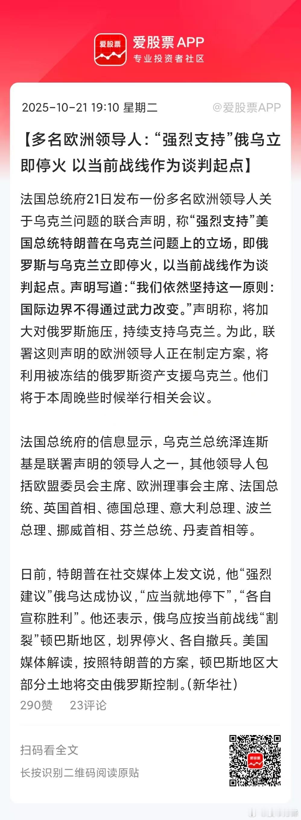 欧洲领导人发布联合声明,表示他们“强烈支持俄乌立即在当前战线停火,并以此为基础启动和谈”!