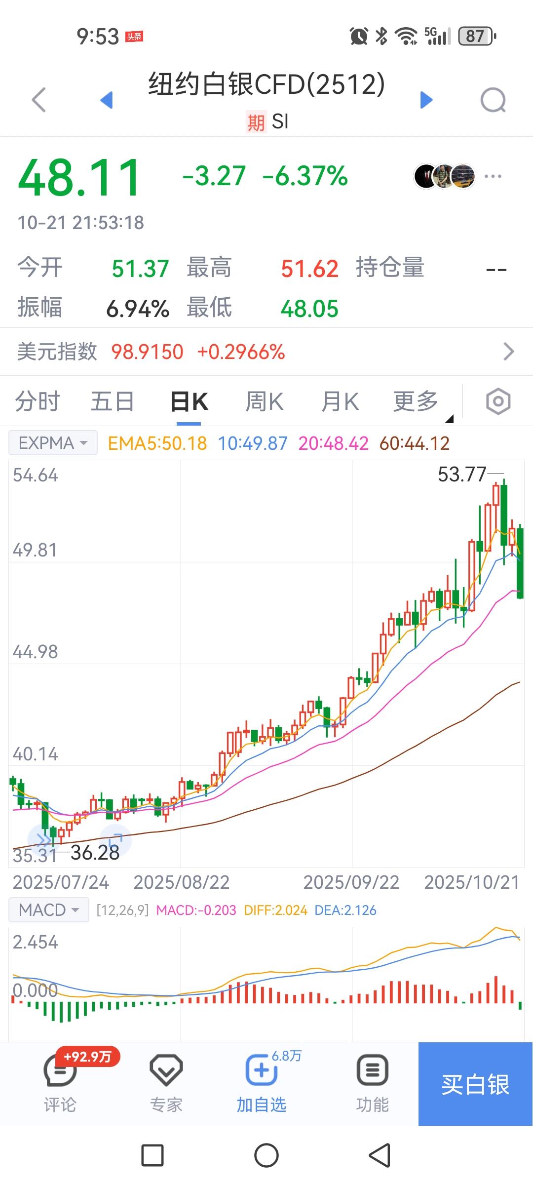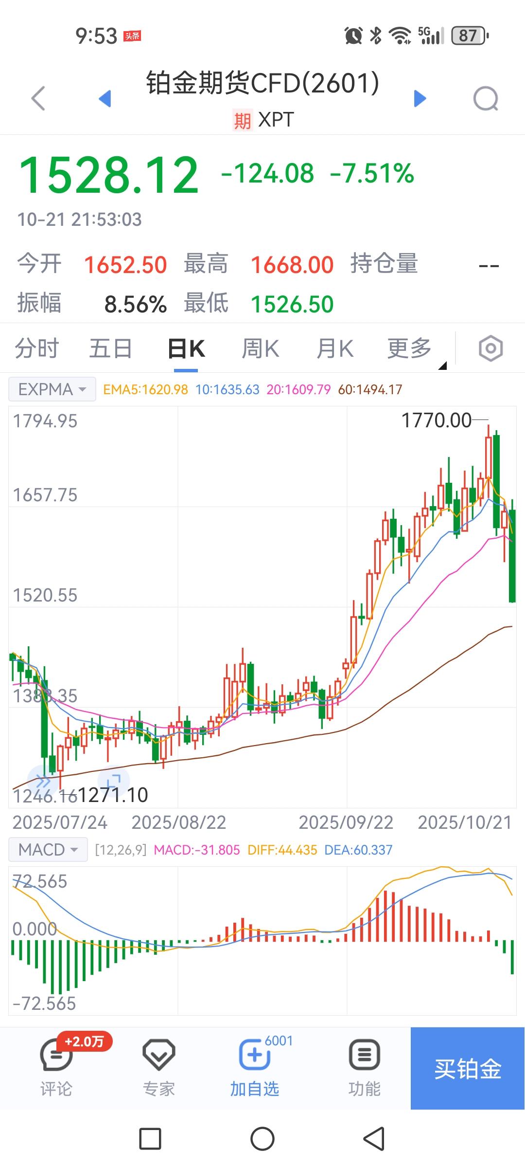 呵呵,贵金属暴跌真正开始了,吃瓜群众搬个小板凳看戏,不知道又有多少博弈者爆仓。 其实,资本市场老手都知道单边极端上涨的最后顶部都会出现巨量长阴线宣告成立,而最后一棒接棒者也是被这根长阴线给震晕的。只要你舍不得割肉出局或者是加较重杠杆去顶部接盘的,这一根长阴线基本就把你打爆仓。