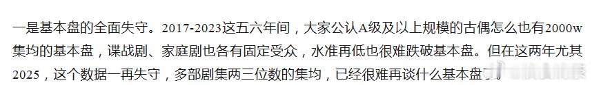 “基本盘的全面失守。2017-2023这五六年间,大家公认A级及以上规模的古偶怎么也有2000w集均的基本盘,谍战剧、家庭剧也各有固定受众,水准再低也很难跌破基本盘。但在这两年尤其2025,这个数据一再失守,多部剧集两三位数的集均,已经很难再谈什么基本盘了。”