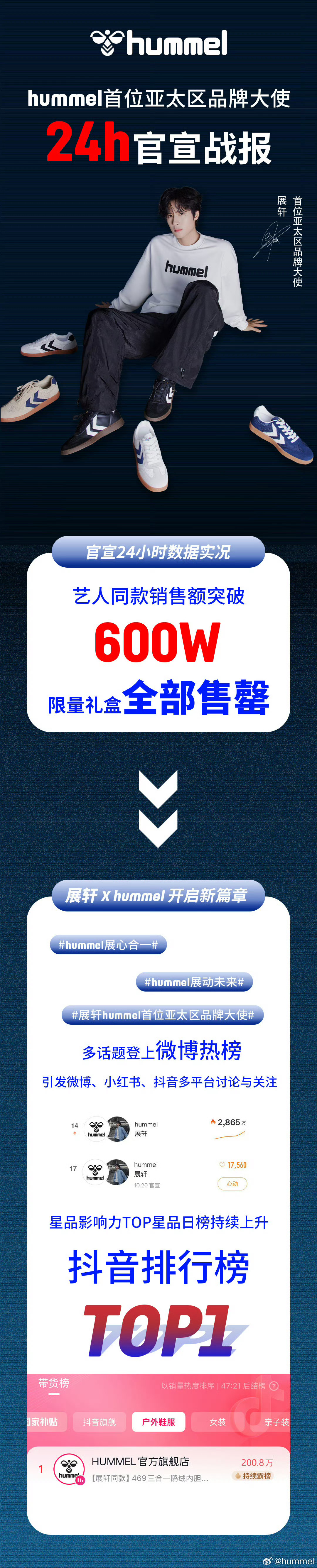 展轩hummel24h战报展轩hummel24小时官方战报 售额破600w 全部售磬很多都抢不到 展轩带货能力杠杠的 [期待]