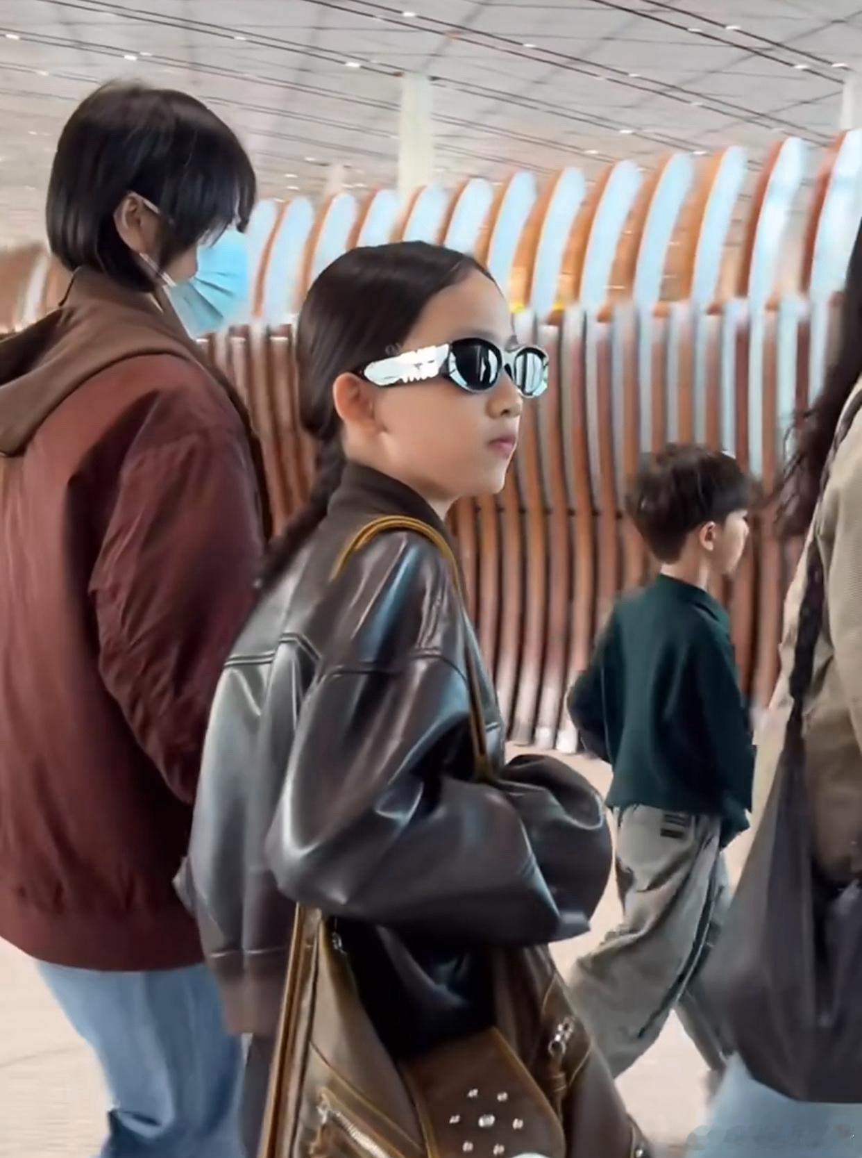 黄少艾穿皮夹克和瑜伽裤,戴着墨镜,气质和姐姐黄多多很像,好像穿着大人衣服,酷酷的。