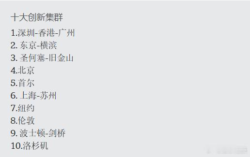 今年,中国首次跻身全球创新指数前十,这得益于其专利数量、科研投入和风险投资的激增。报告中列出的100个领先集群中,中国目前占据了24个,其中华南科技中心深圳-香港-广州位居第一。