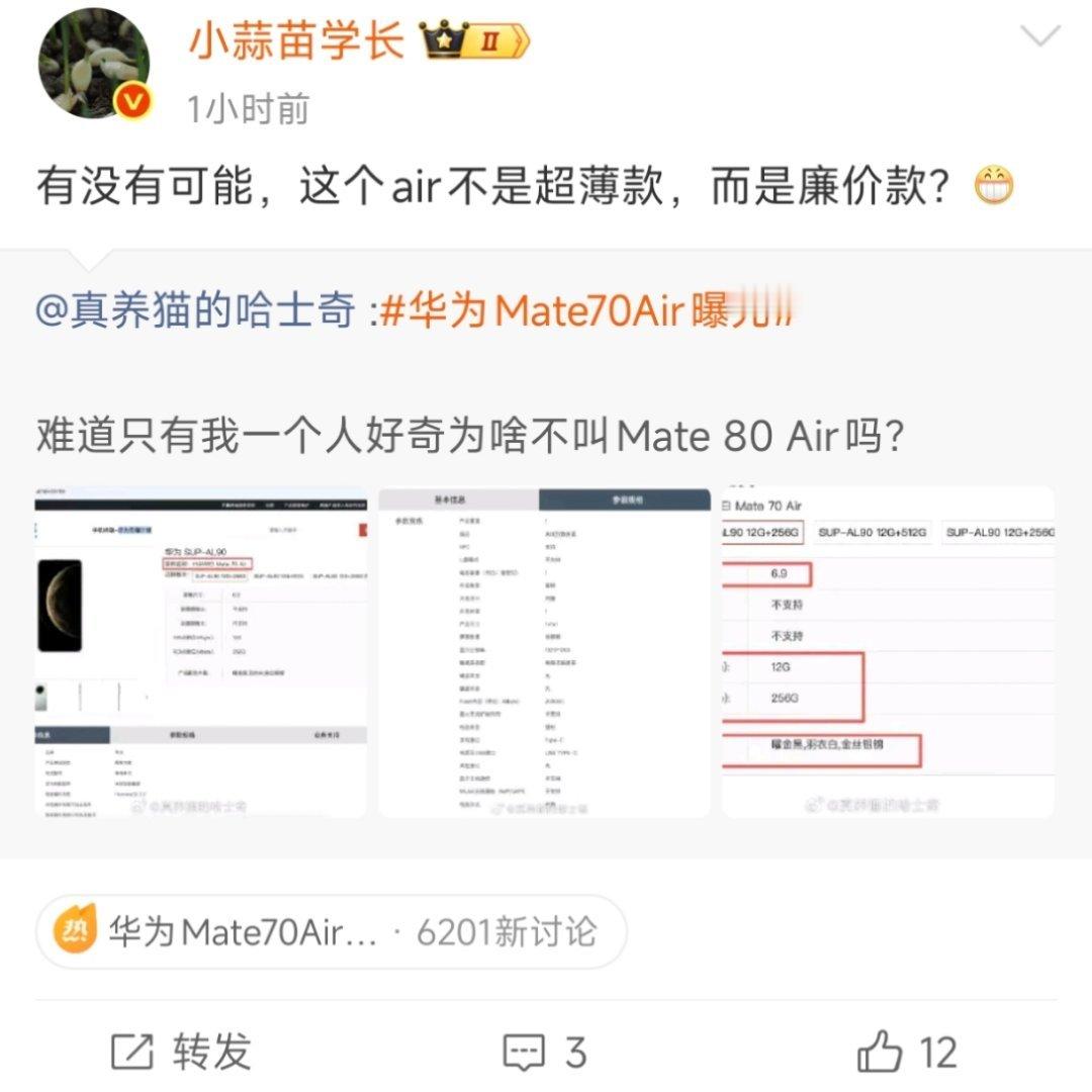 卧槽,华为也有Air了Mate70Air,不知道轻薄程度能做到那个程度