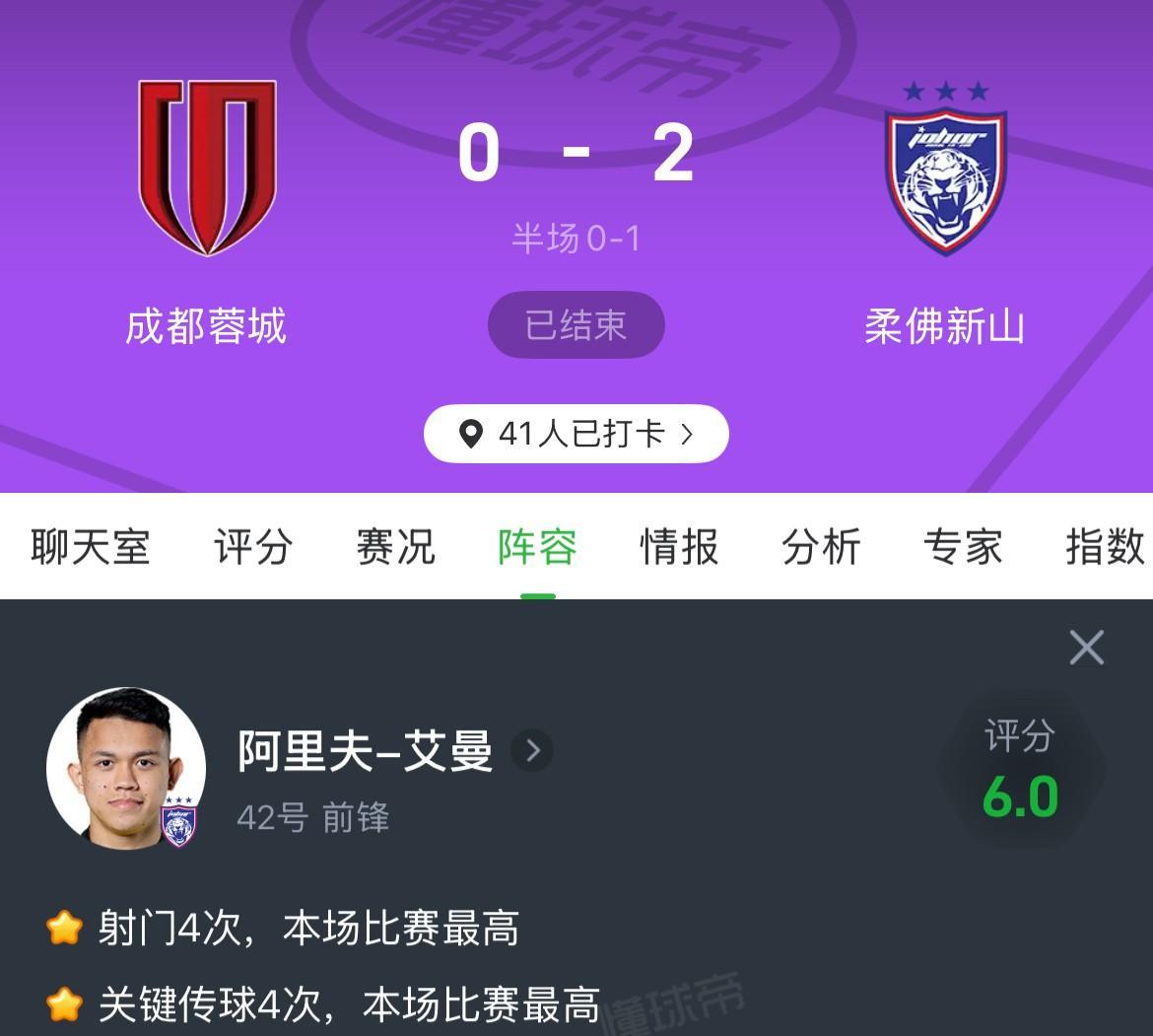 亚冠蓉城0-2柔佛新山,射门和关键传球次数全场最高的是柔佛本土球员阿里夫埃曼,今年入围了亚洲足球先生提名。 本场比赛他没有进球,有4脚射门,是本场比赛最高,屡屡造成蓉城门前险情。 阿里夫埃曼徳转身价只有65欧,有点偏低,但这并不妨碍他获得今年亚洲足球先生的提名!他也是首位获得该奖项提名的马来西亚球员。 在2024年亚冠,对阵上海海港的客场比赛中,他曾上演梅开二度,成功从客场带走1分 ,柔佛新山最终获得东亚区第三晋级16强。