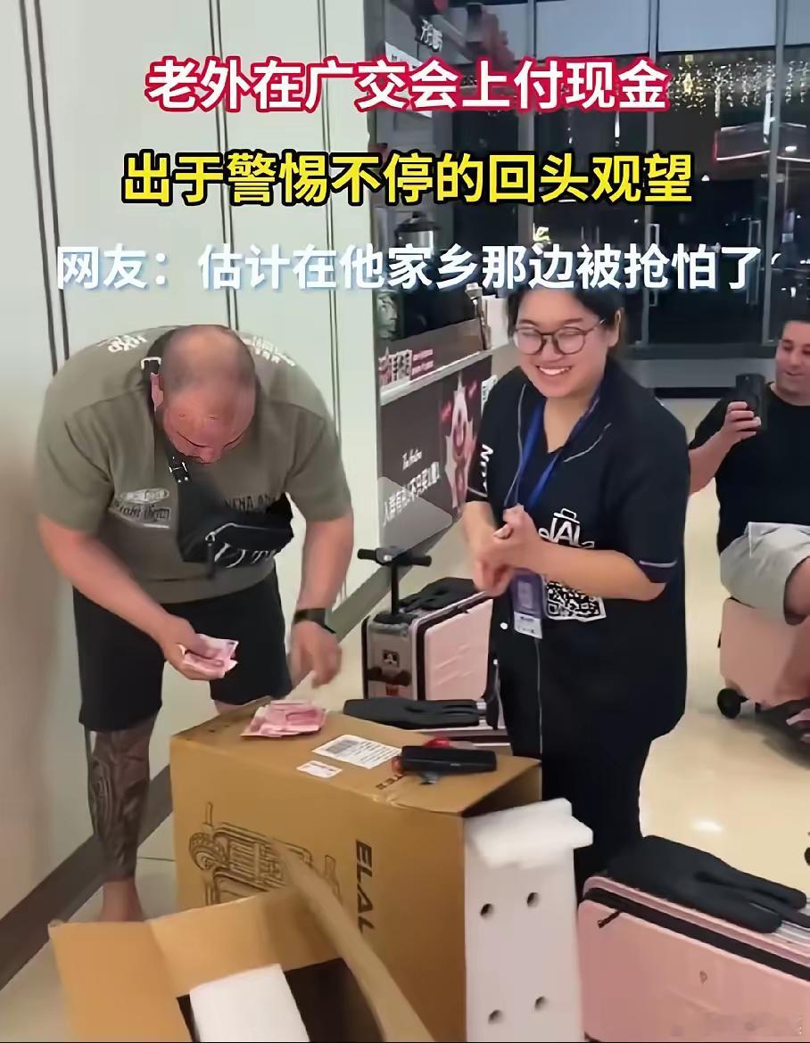 老外在广交会现金付账,警惕的不停四处张望,把收钱小姐姐都搞笑了。估计是在自己国家被抢怕了!