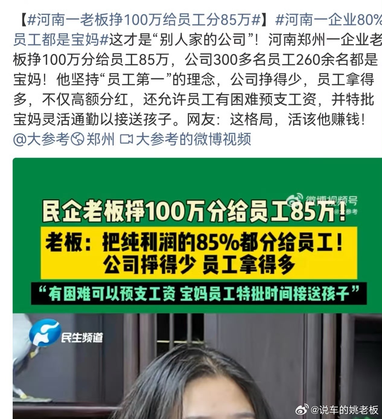 河南一老板挣100万给员工分85万老板说"想让宝妈不用手心朝上要钱",而宝妈们用