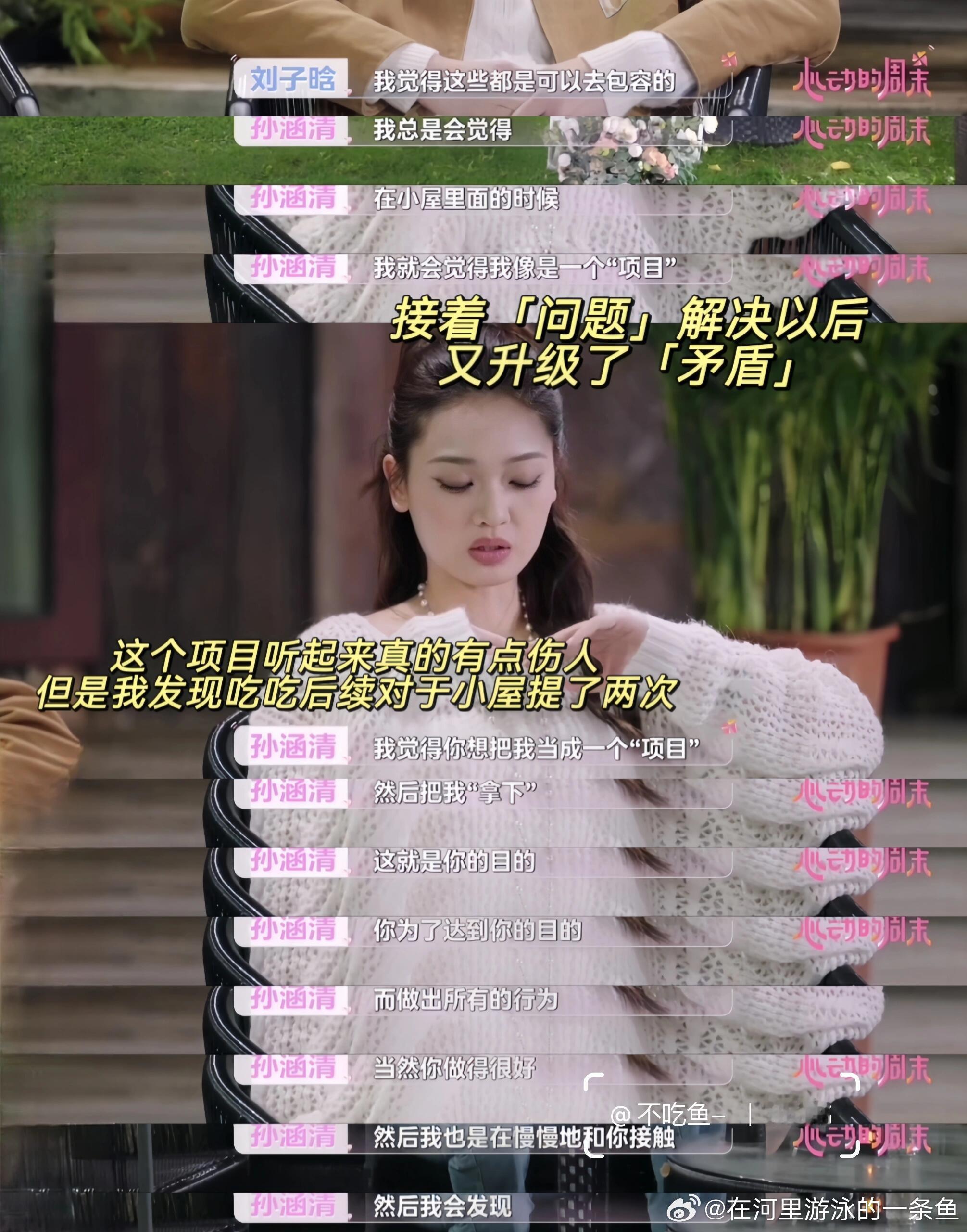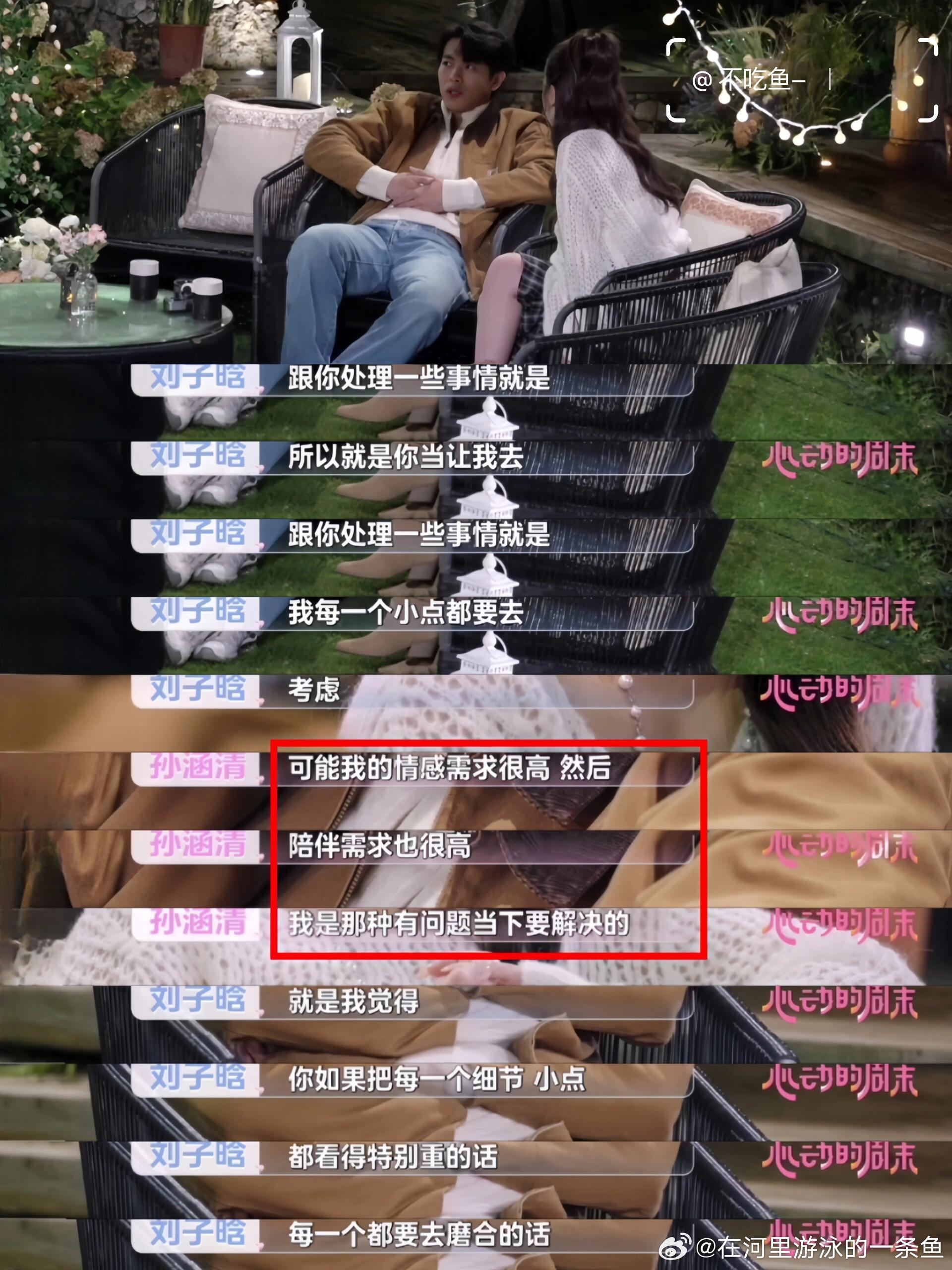 吃吃和老六这段谈话很值得学习📌吃吃的沟通模式是不开心了,讲一个否定句等对方反驳。比如先说亲密关系不在意,然后等老六反驳。再是提出自己被当做项目,等老六澄清。