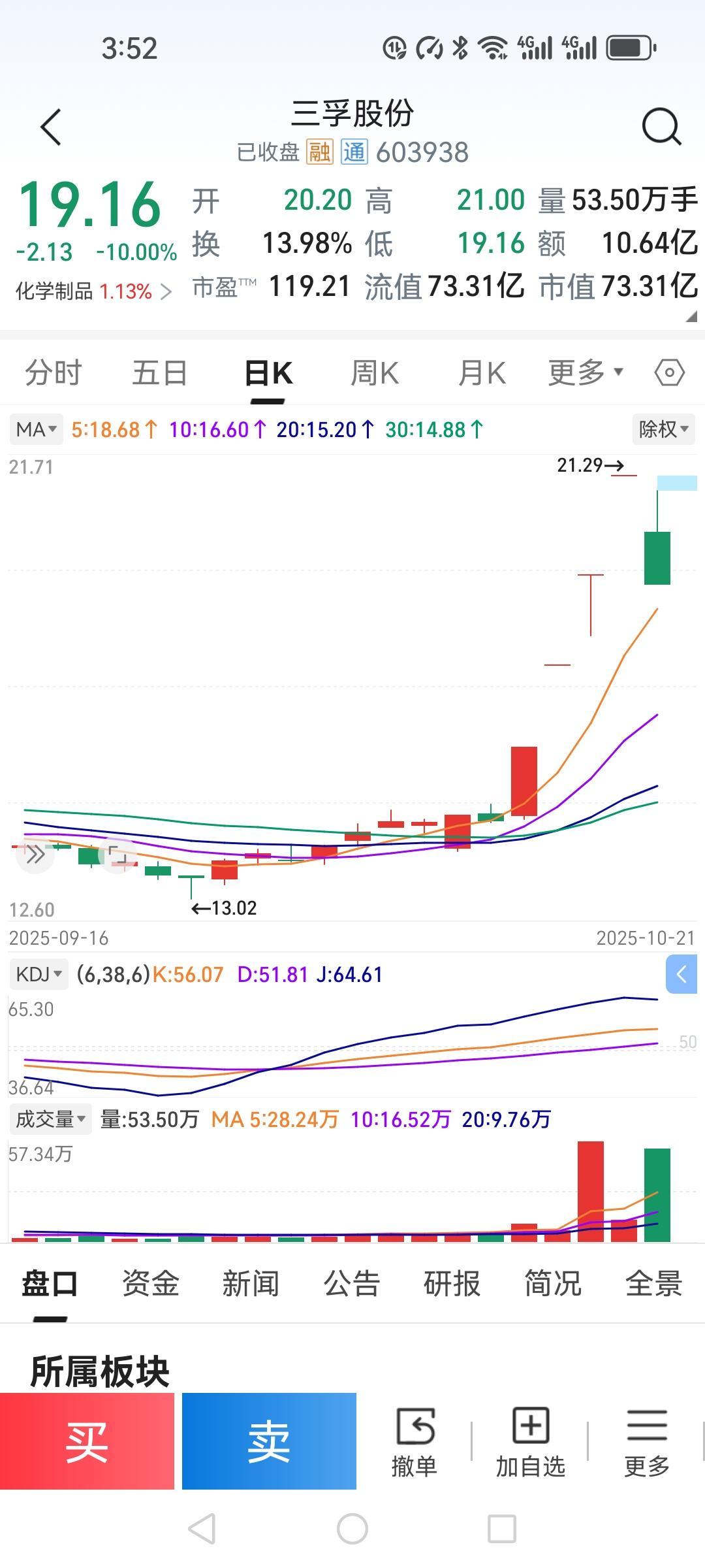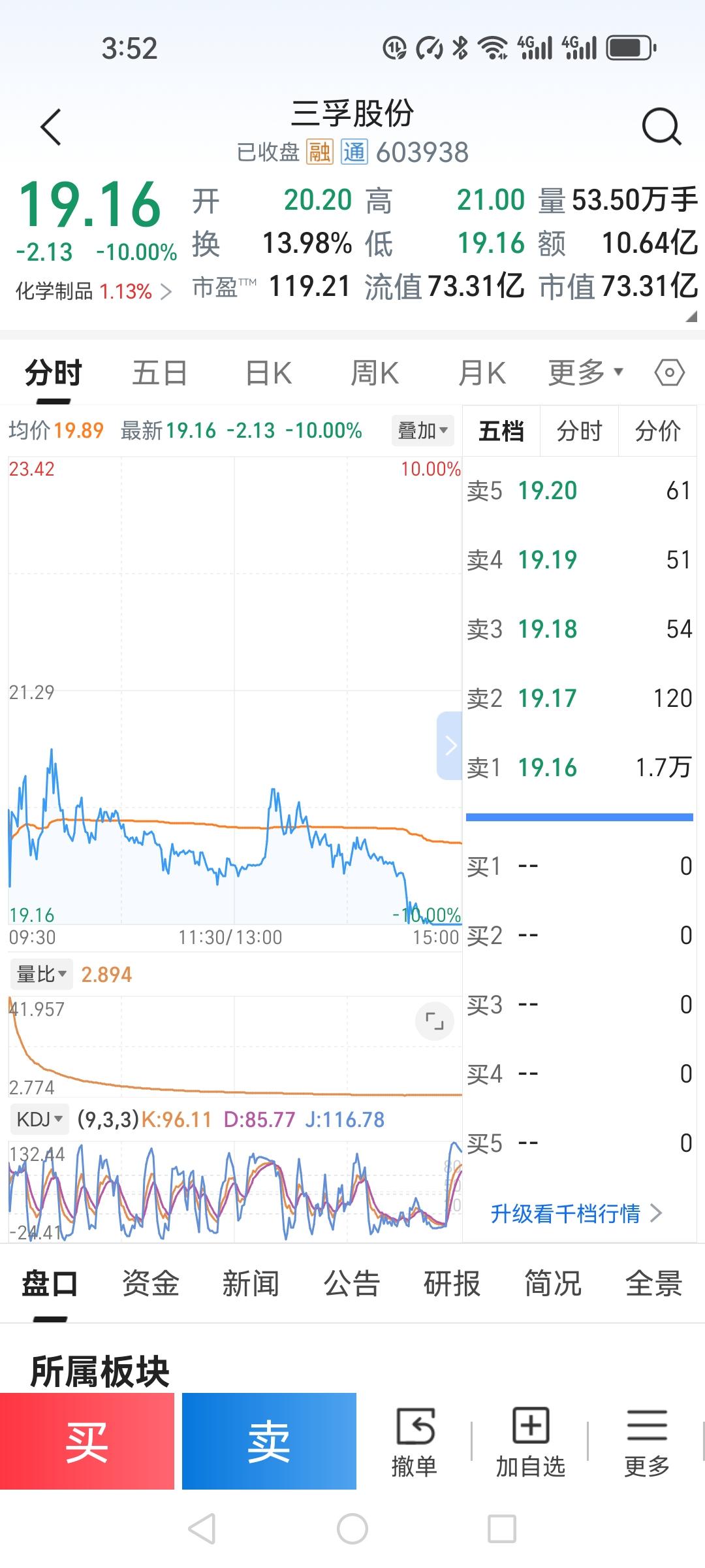又有网友开心的报喜,以跌停价19.16买入三孚股份4000股,感到非常开心。 他预判明天要反包走一字板,反正今年是科技股牛市,三孚股份有存储芯片等科技股慨念,持有该股他放心,庆幸买入了最低点。 但是我打开软件,看了三孚股份的图形,我并不为他高兴,反而替他担心,在跌停板以前三孚已经连续4个涨停板了,从K线图上看,今天是一根放量大阴线,收了一个到锤子阴线,明天怎么会反包涨停呢,很明显的是庄家在出货。 我不知道这个网友是怎么想的,我是看了这种走势是不敢买的,肯定还会下跌,他很可能就要给人家站岗了。我只是很浅薄的谈了自己的一点看法,也不知道对不对,还望网友指教,个人观点,仅供参考,股市有风险,投资需谨慎。三连板 天孚集团 炒股心得分享 怎样快速提高自己的炒股水平?