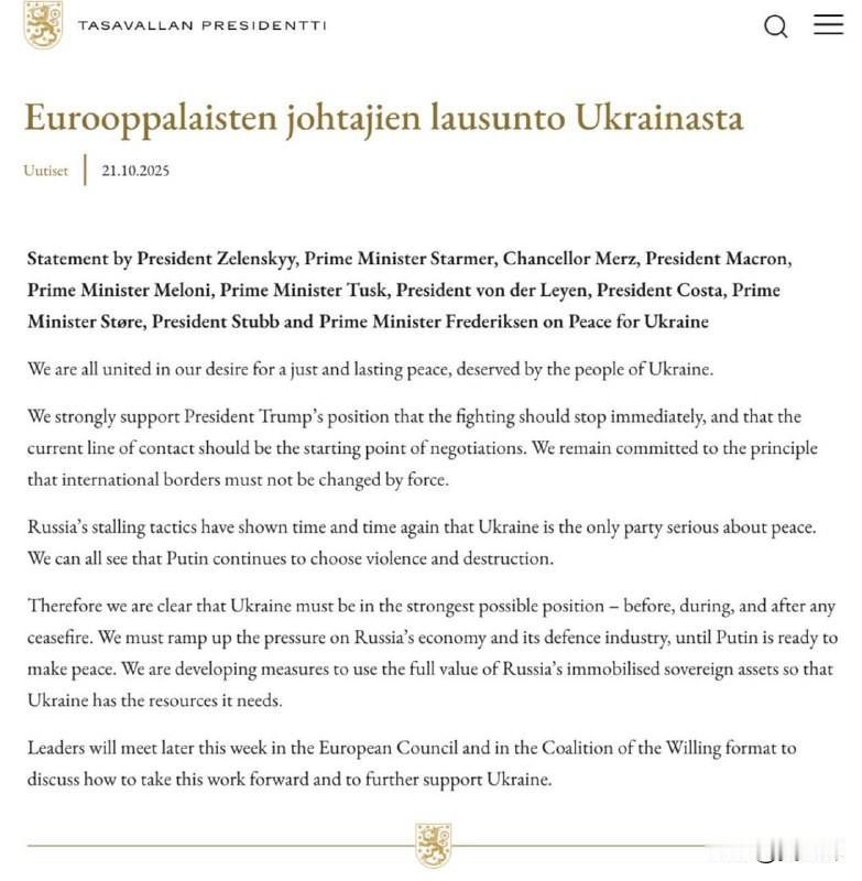 据芬兰总统官网21日消息,泽连斯基总统与欧洲领导人已批准特朗普提出的立即停火计划。 “我们完全支持特朗普总统的观点,即必须立即停止军事行动,且当前接触线应成为未来谈判的基础。我们认识到,乌克兰必须在任何停火之前、之中和之后都处于尽可能有利的地位。我们需要加大对俄罗斯经济和国防部门的压力,直到普京准备好走向和平。我们正在制定相关措施,以动用所有被冻结的俄罗斯主权资产,确保乌克兰获得所需资源。”