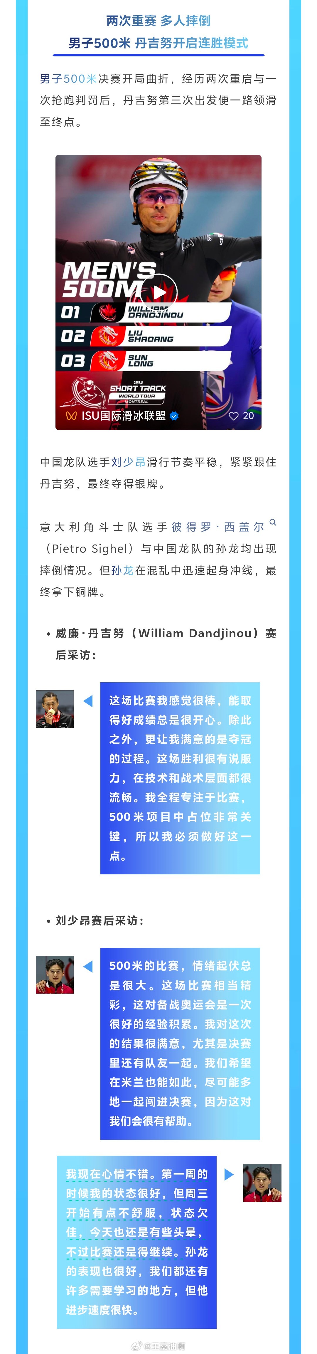 500米的比赛,情绪起伏总是很大。这场比赛相当精彩,这对备战奥运会是一次很好的经验积累。我对这次的结果很满意,尤其是决赛里还有队友一起。我们希望在米兰也能如此,尽可能多地一起闯进决赛,因为这对我们会很有帮助。