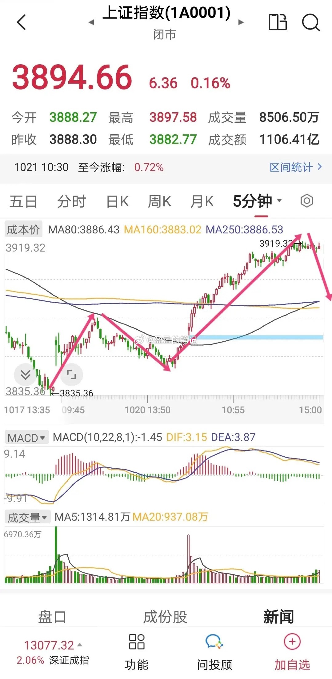 5分钟昨天盘中已经形成了上涨线段结构。接下来简单多了,就是观察这个上涨线段怎么延伸,只要不出现线段破坏,跟随延伸即可。