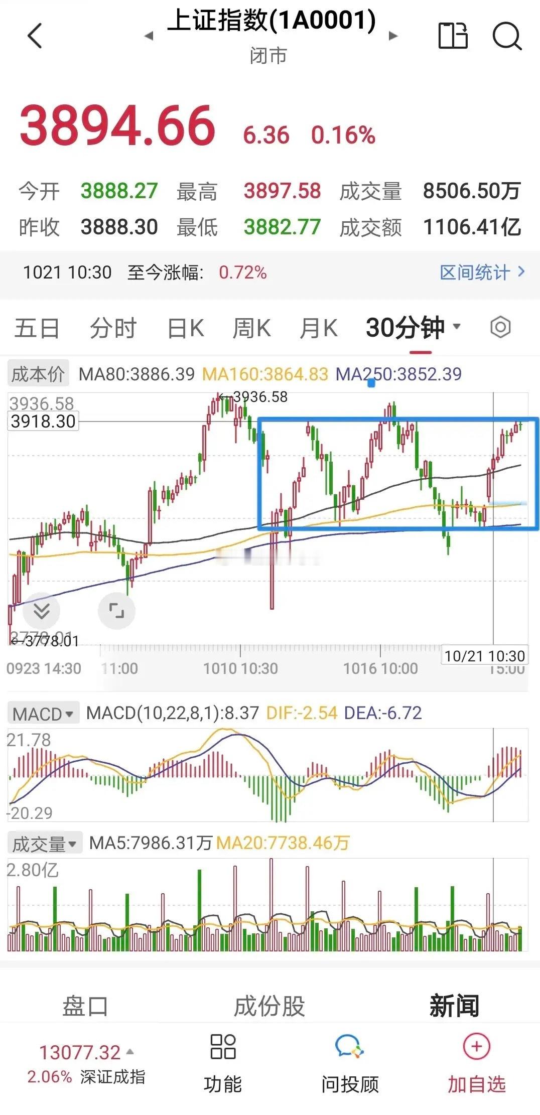 30分钟还是中枢震荡,当下已经来到了中枢的上边界,看看能否突破中枢压制。突破了,新高可期,突破不了,重新进入震荡。