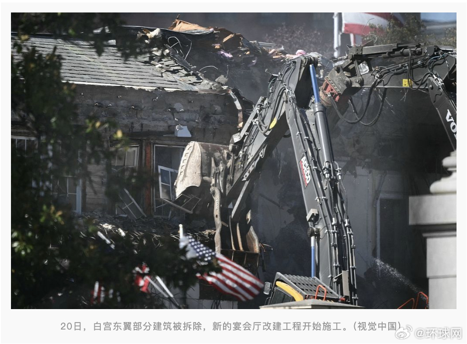 #白宫东翼爆改豪华宴会厅#【恰逢美政府停摆,被疑大兴土木,#白宫东翼2.5亿美元爆改豪华宴会厅#】日前,美国白宫启动大规模改建工程,东翼一侧已进入拆除阶段。美国有线电视新闻网(CNN)21日报道称,美国总统特朗普已于20日晚在社交媒体“真实社交”上发文证实这一消息,称“已着手建设一座全新、宏伟且美丽的宴会厅”,新建筑落成后将与白宫主建筑群分离,同时整个白宫东翼也将得到全面改造。