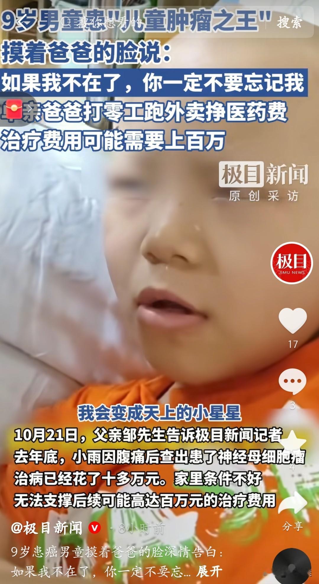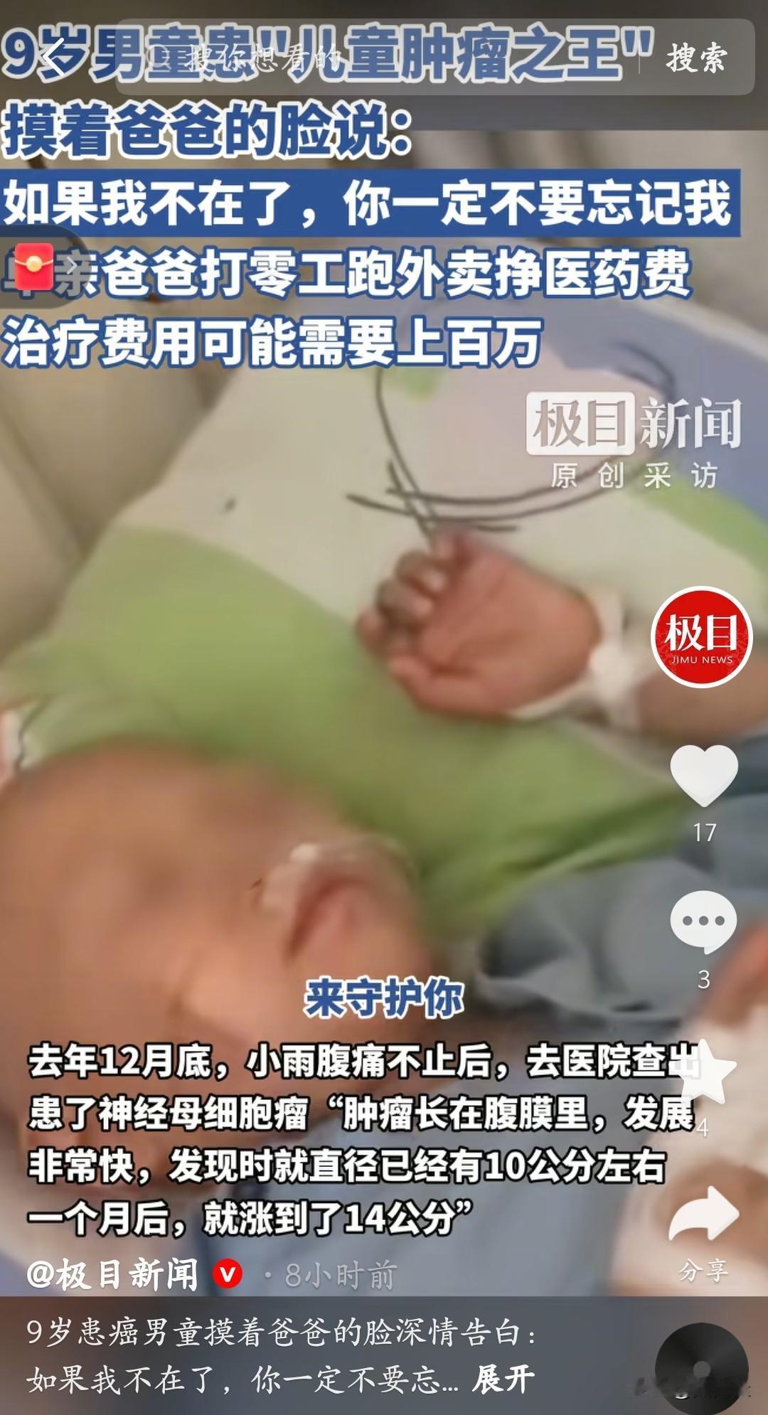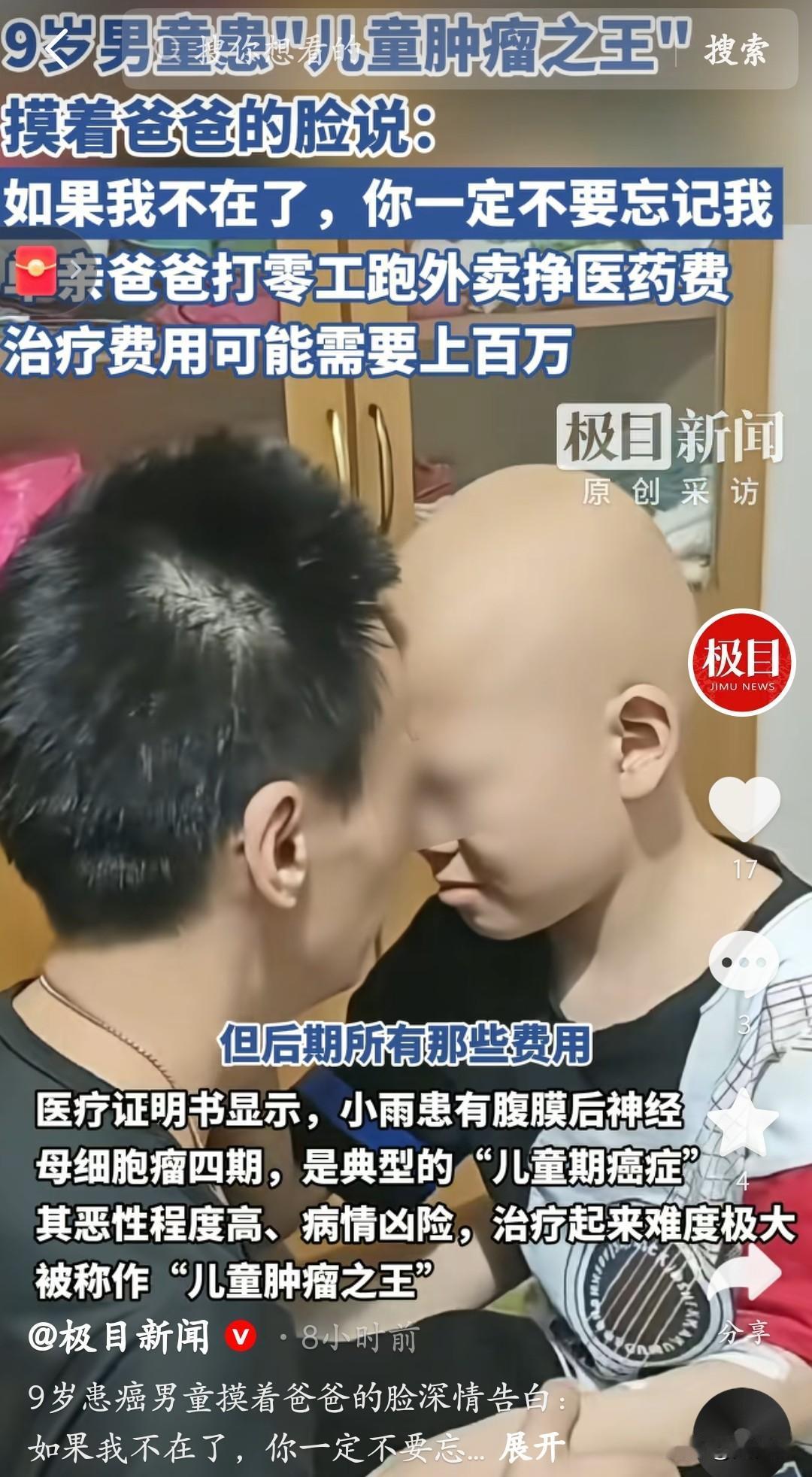 “爸爸,如果有一天我不在了,你一定不要忘记我,我会变成天上的星星守着你”。这是只有9岁的小雨说给爸爸的话! 他得的是“儿童肿瘤之王”神经母细胞瘤,肚子里的瘤子一个月从10厘米疯长到14厘米。爸爸打零工、跑外卖,攒的十几万早花光了,后续上百万治疗费像座山。 谁看了能不心疼?这么小的孩子,懂事得让人心碎。希望能有更多人伸把手,帮这对父子扛过这关。