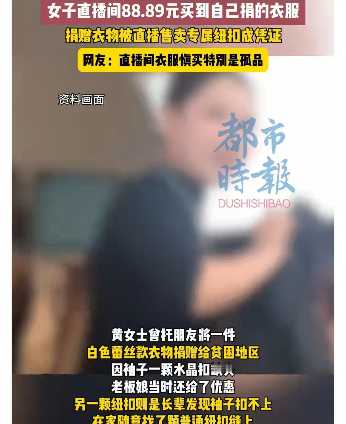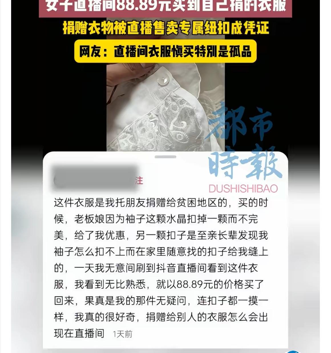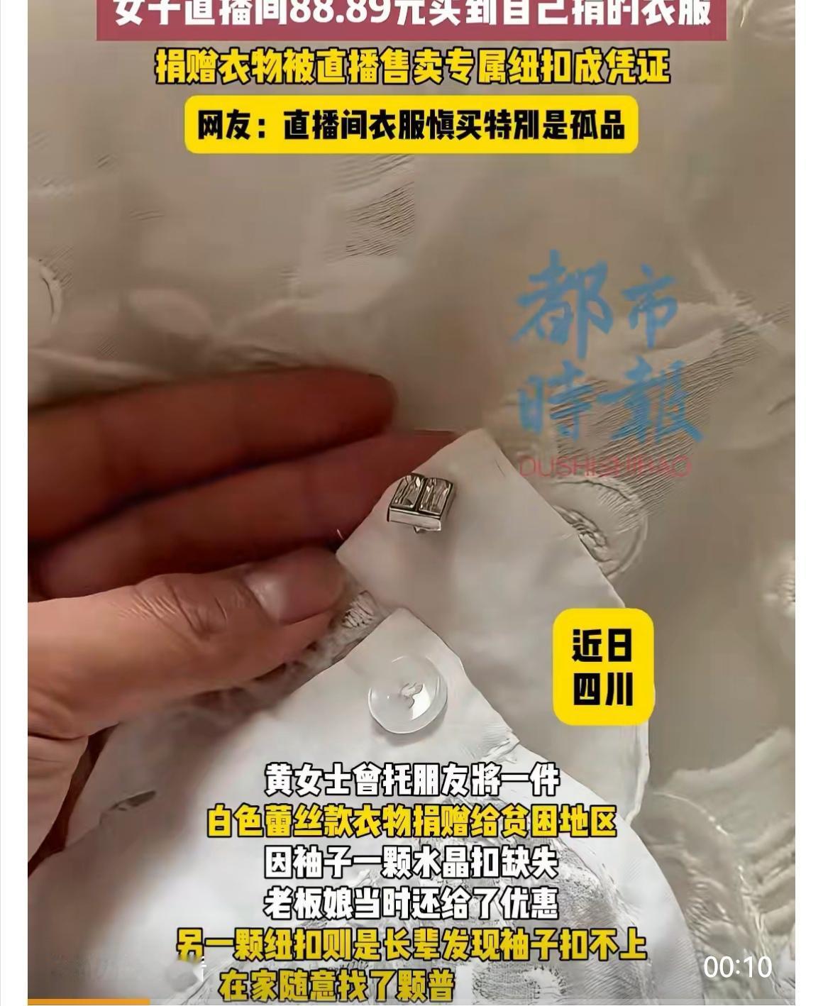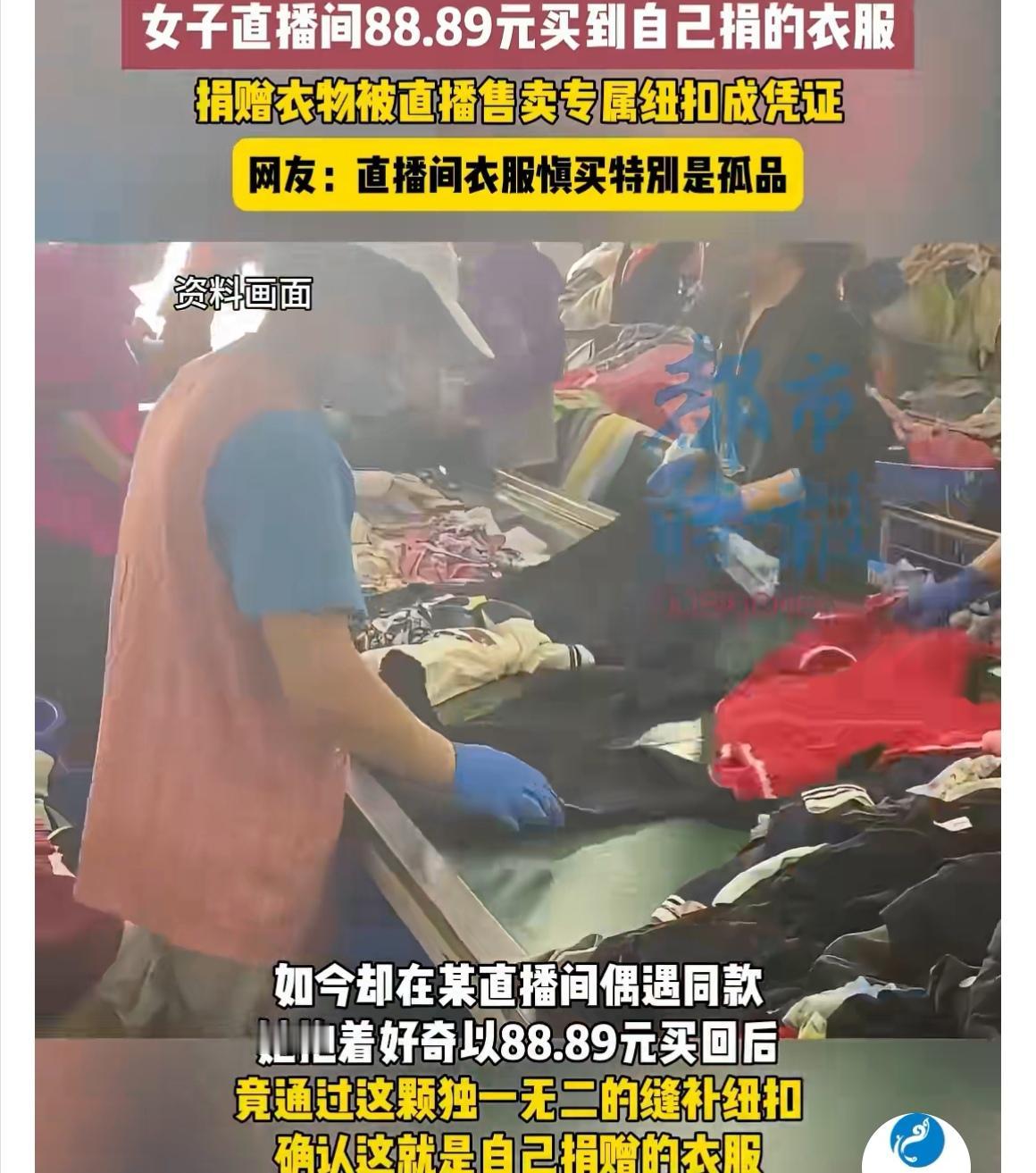 【惊喜还是尴尬?女子在直播间“偶遇”自己的捐赠衣服】 你能想象吗?辛辛苦苦捐出去的旧衣服,竟然会在直播间里被自己买回来!近日,四川的黄女士就遇到了这样一件让人又哭又笑的事情。 原来,黄女士之前把一件白色衣物托朋友捐赠出去了。当时这件衣服还有点“小毛病”——袖子少了一颗水晶扣,所以商家还特意给了优惠;另一颗纽扣则是家里的长辈随手缝上的,不太搭,但很有纪念意义。没想到,转了一圈,这件特别的衣服却在某直播间出现了!出于对同款的好奇,黄女士用88.89元下单买了回来,结果收到货后,一眼认出袖子上那颗独一无二的纽扣,这居然就是自家亲手送走的衣服! 此事引发不少网友讨论:本以为捐赠出去的衣服可以帮助有需要的人,怎么就跑到了直播电商的货架上?有人理解回收端的一些处理方式,但也有人希望相关机构能更透明说明衣物流向,避免善意被误解。 这种“巧遇”,也提醒大家:二手衣物的捐赠和回收,绝不是简单地“一捐了之”。背后的流程、渠道以及管理,各方都要严肃对待,让爱心真正落到实处。不过话说回来,这样“巧妙重逢”的场面,你遇上了会是什么反应?