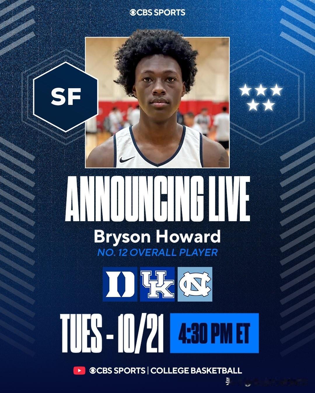 TOP20五星分卫Bryson Howard宣布承诺NCAA男篮 杜克大学,来自德州,身高6-5=196,选择蓝魔是因为我觉得自己非常适合球队的体系,这里的每个人都像家人一样对待彼此,这让我觉得这里就是我的家,父亲约什-霍华德在NBA征战了10个赛季,曾在维克森林大学打球。