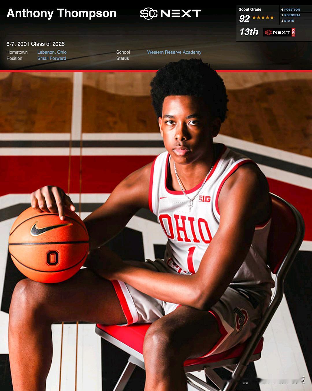 五星小前锋Anthony Thompson宣布承诺NCAA男篮 俄亥俄州立,身高6-8=203,高四赛季就读于俄亥俄州Western Reserve,这是自2014年拉塞尔D'Angelo Russell以来球队收到的排名最高的球员,主帅Jake Diebler留住的第三位州内本地的加盟者,之前还有Marcus Johnson与Alex Smith。