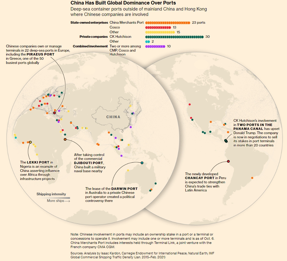 根据卡内基国际和平研究院汇编的数据,中国公司在海外90多个深水港拥有或运营码头。其中包括劳合社排名的前100个最繁忙港口中的34个。持股包括欧洲第五大集装箱港口、南美太平洋沿岸第一个能够处理超大型集装箱船的深海港口,以及非洲超过三分之一的商业港口的权益。